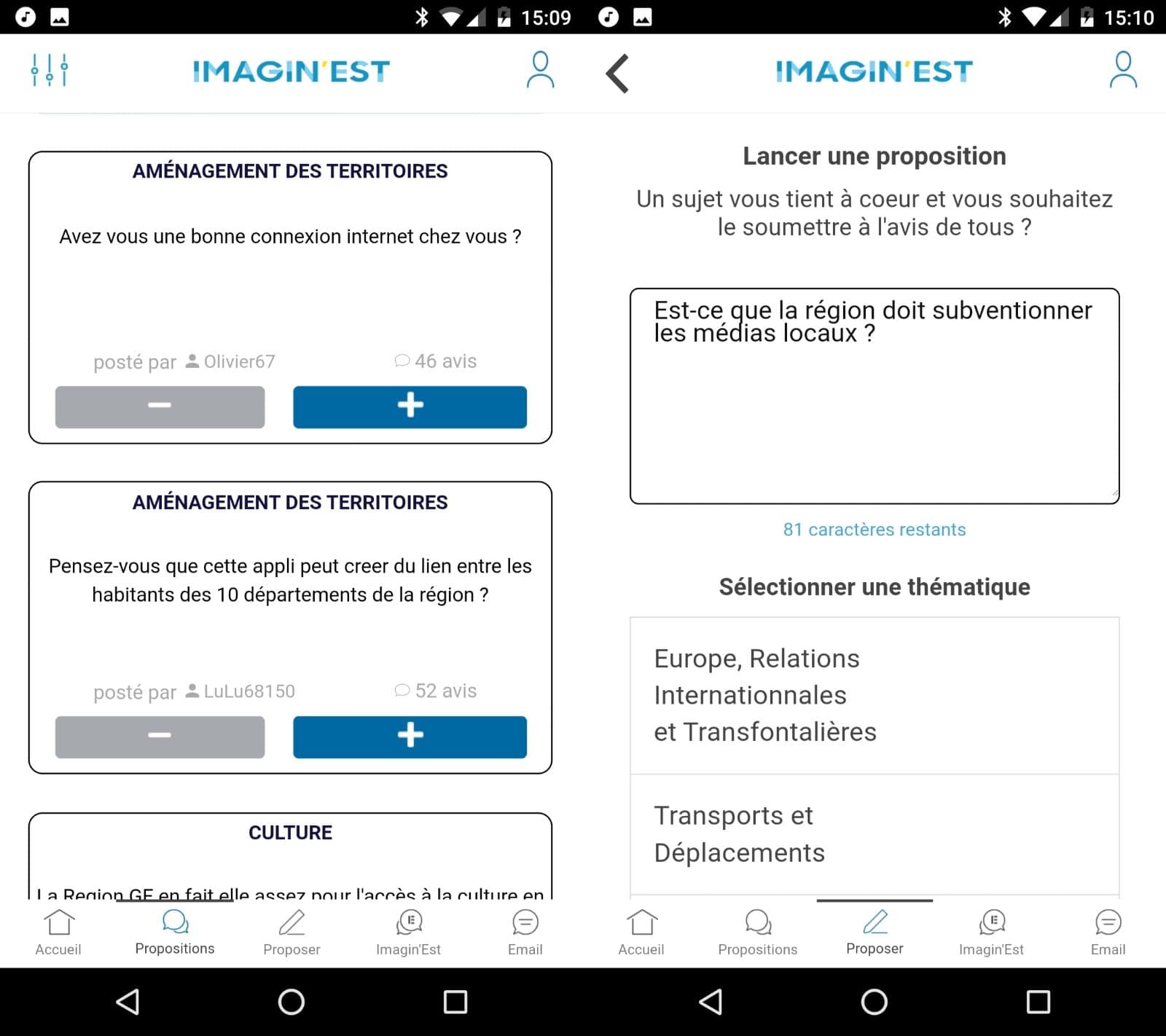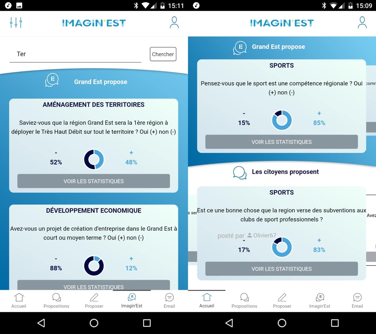 Pour la Région Grand Est, Gov a adapté et vendu sa technologie entre « 30 et 50 000€ » par an pour une application similaire, appelée « Imagin’Est ». Les utilisateurs et la Région Grand Est peuvent proposer aux votes des débats ou des questions dans chacune des thématiques correspondantes aux compétences du conseil régional (Europe, transports, formation, environnement…). Les statistiques de chaque question sont accessibles à ceux qui ont « voté » (tranches d’âges, genre, départements d’origine)… Les débats ouverts par les citoyens sont d’abord modérés avant d’être publiés, puis proposés sur un fond blanc tandis que les questions issues de la Région sont sur fond bleu.