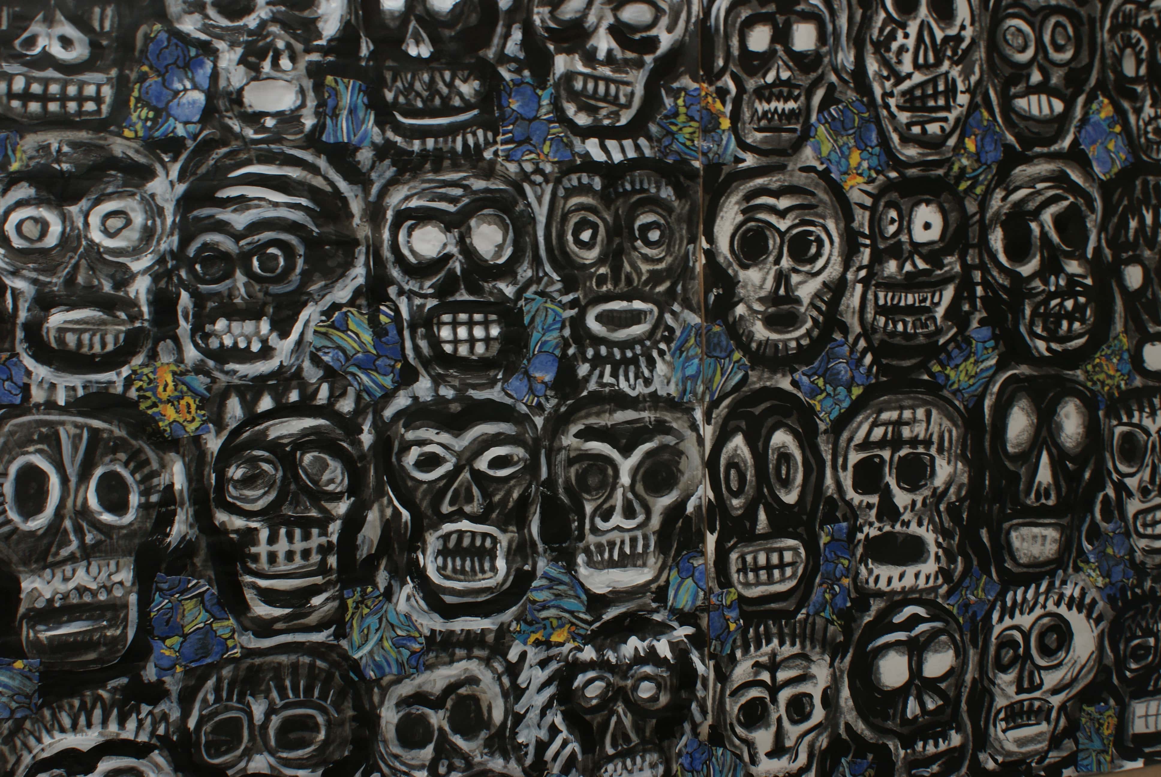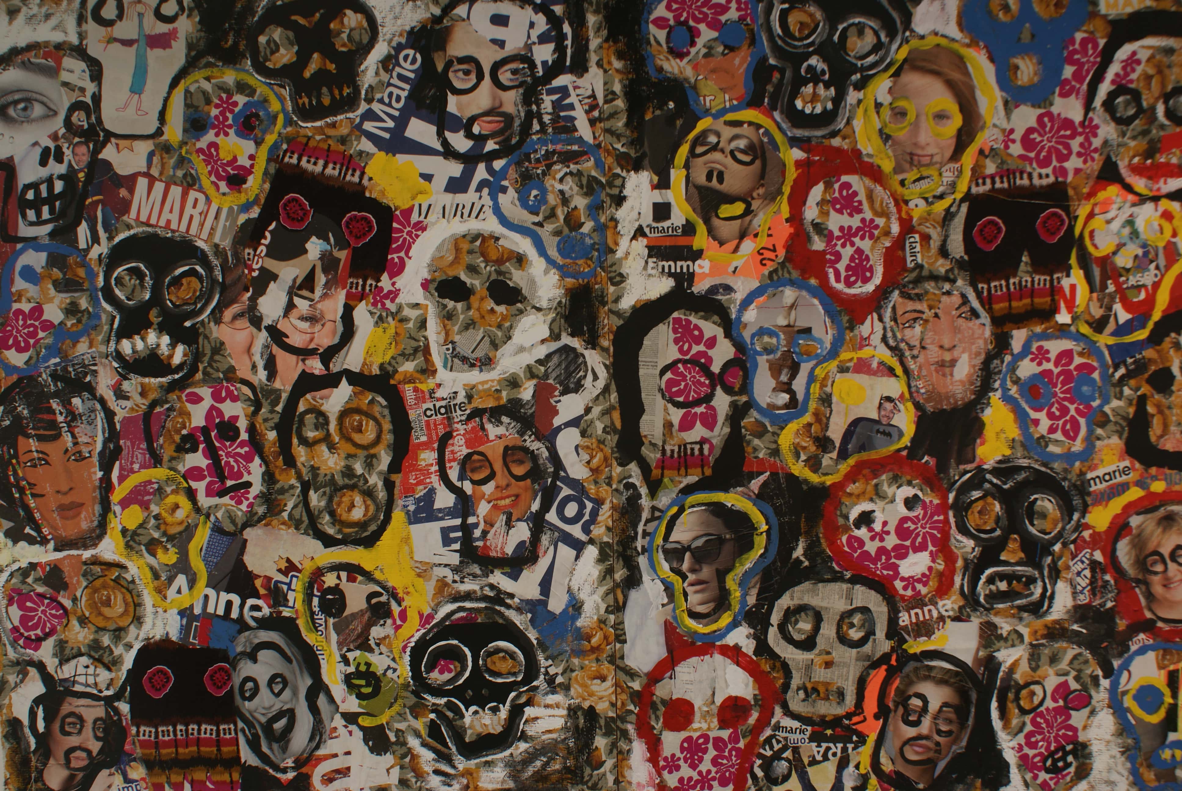 Pas de rétrospective pour cette mise en espace, les organisateurs laissent le soin aux institutions culturelles de s’en charger. Avec “Ne crânez plus”, le public a l’occasion de découvrir une série d’œuvres réalisées entre 2010 et 2013. Une accumulation de crânes, telles des tapisseries, orne les murs de l’espace Le Couloir. Les crânes sont toujours accompagnés de collages, d’assemblages, de tissus floraux ou de tapisseries à fleurs. Ils sont des figures expressives, parfois expressionnistes. Il s’agit d’un canevas ornemental fait de papier journal, de photos de mannequins, de femmes présentes dans les magazines, mais également de papier peint, de papiers d’emballage, de serviettes en papier ou de tissus à fleurs.