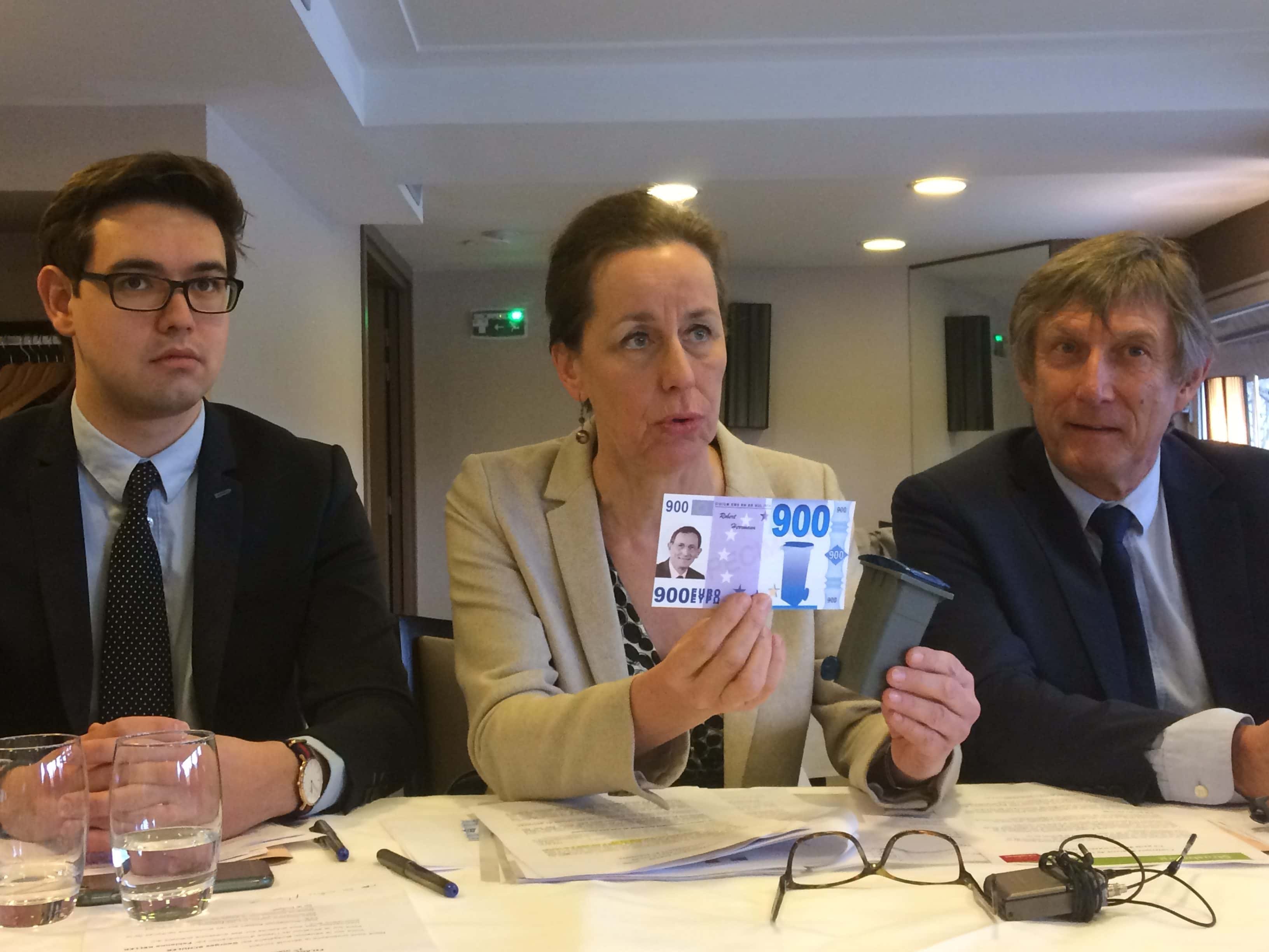 Fabienne Keller, tente de comparer cette crise évaluée à 180 millions d’euros au minimum, à d’autres dépenses de l’Eurométropole, en se fendant d’un faux billet de 900 euros pour la démonstration :