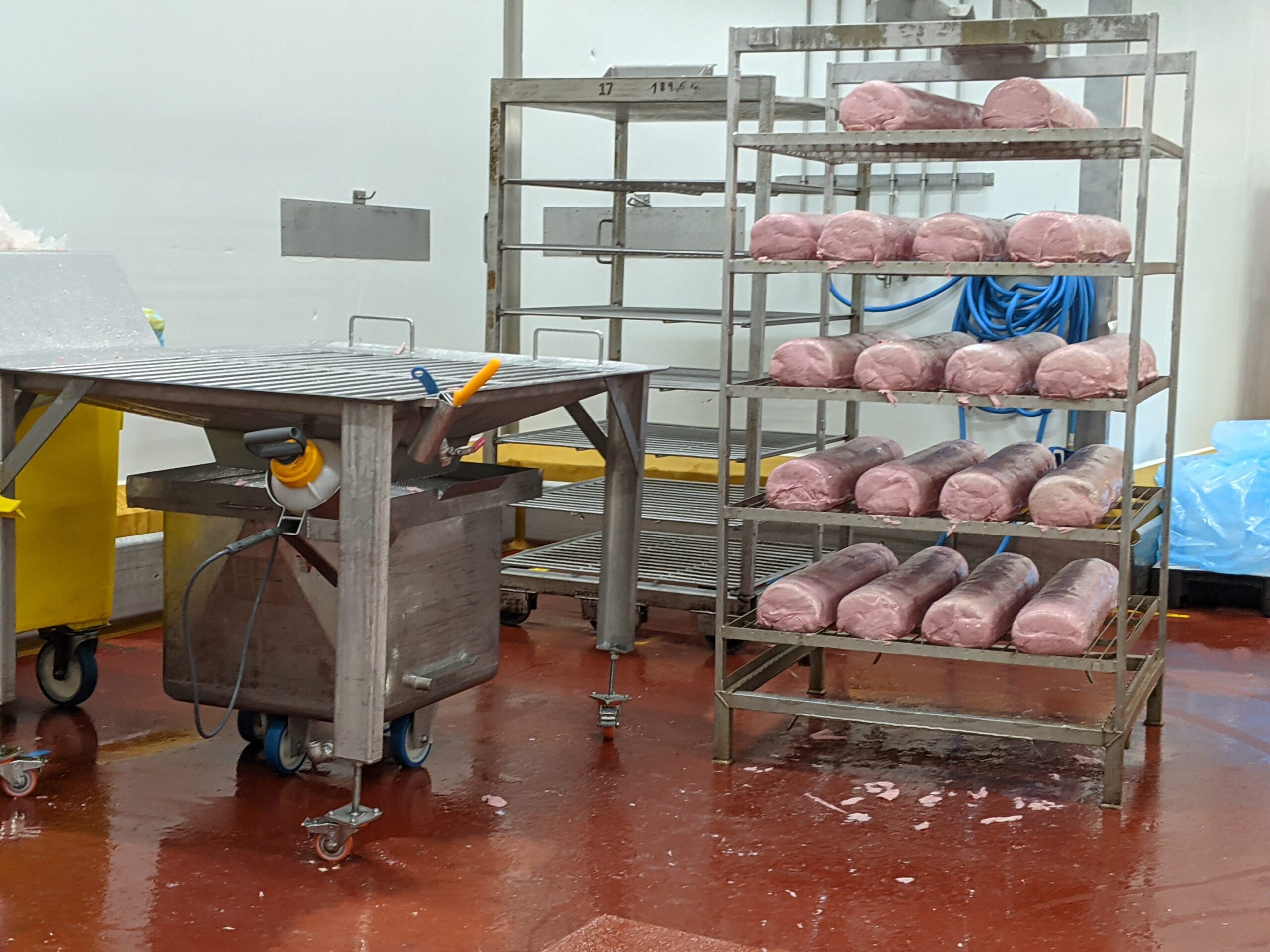 Je comprends très vite que l’on n’a pas besoin de moi en MSP. On m’indique le démoulage, où des pains de jambons d’environ un mètre de long doivent être sortis manuellement de leur moule en métal. Les jeunes intérimaires les placent ensuite sur des étagères à trois niveaux. J’essaye d’imiter les ouvriers devant moi… mais la supérieure se ravise. « C’est trop dangereux de travailler à trois comme ça, tu vas aller à la rôtissoire. »