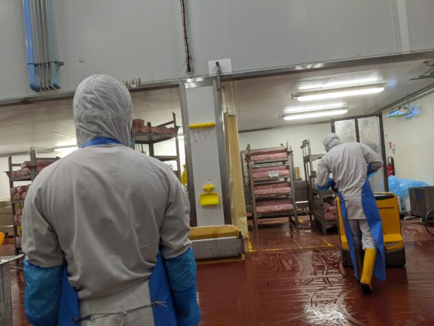 Habillé d’un t-shirt, d’un pantalon, d’une veste et d’une surblouse blanches, ainsi que d’une charlotte verte, un cache-barbe, je peux me diriger vers le rez-de-chaussée du bâtiment. Avant de descendre un escalier métallique, je passe un portique sanitaire où des voyants verts me confirment que je me suis bien lavé et désinfecté les mains. Après avoir longé la partie tranchage et emballage du jambon, ma formatrice me laisse entre les mains d’une cheffe d’équipe.