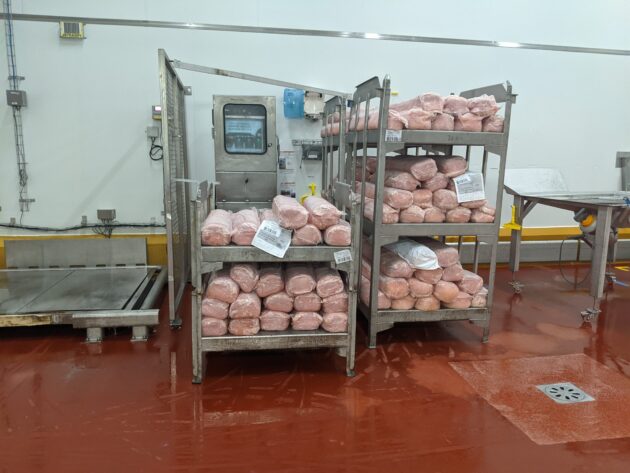 Les pains de jambons, de plus d’une vingtaine de kilos, arrivent emballés dans du plastique sur des étagères.