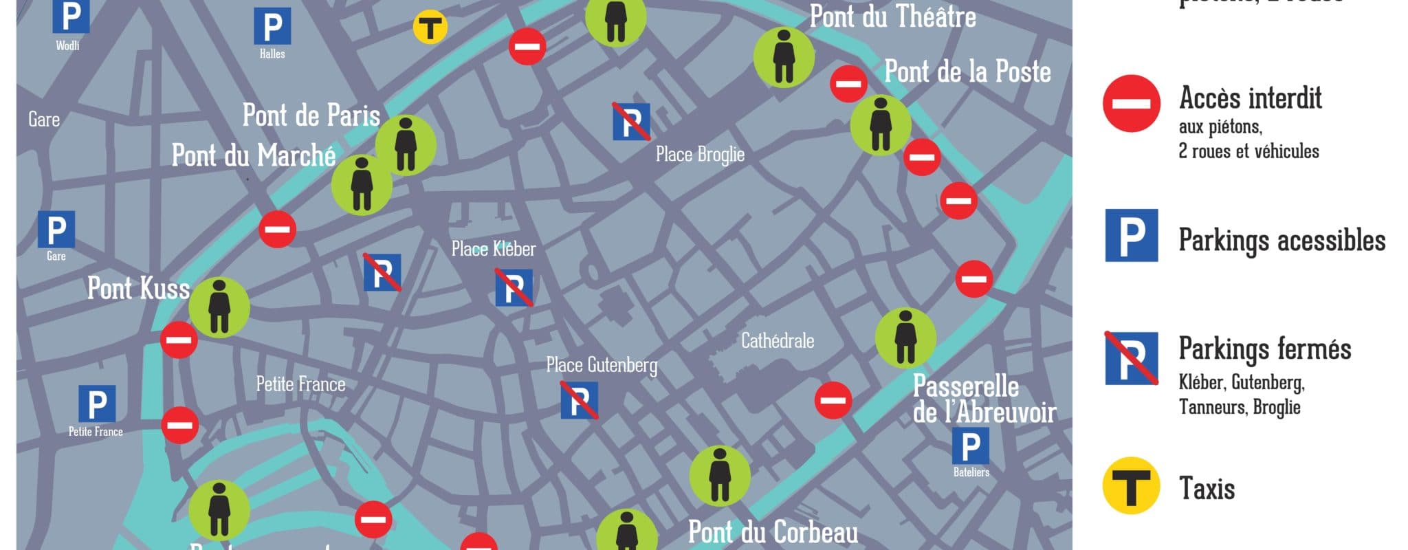 La circulation et le stationnement dans la rue seront interdits dès le vendredi 27 juillet à 22h, jusqu’au lendemain à 23h. Les 4 parkings publics de l’hypercentre (Gutenberg, Tanneurs, Kléber et Broglie) seront fermés à partir de 4h30 le samedi, ce qui laisse encore le temps pour les abonnés résidant dans le centre de sortir dans la nuit par le pont du Théâtre ou le pont Saint Nicolas.