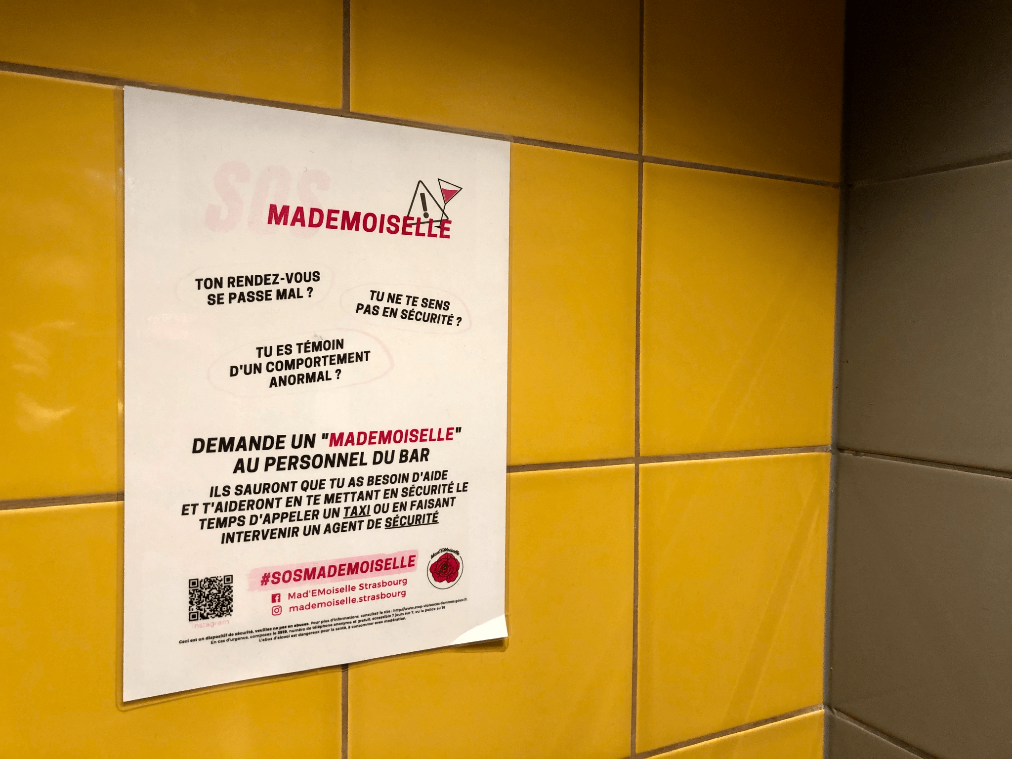 L’une de ces solutions : un cocktail fictif. Depuis la rentrée 2020, des affiches de l’association Mad’EMoiselle indiquent dans les toilettes d’une trentaine de bars strasbourgeois qu’il est possible de commander un « cocktail Mademoiselle » si un rendez-vous se passe mal ou si une personne se sent en danger.