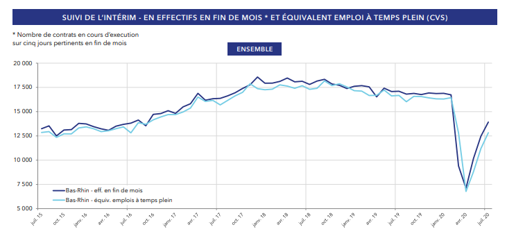 En France, au deuxième trimestre de 2020, le volume de travail en intérim a atteint son niveau le plus faible depuis qu’il a commencé à être mesuré, en 2000. Selon Pôle emploi, joint par Rue89 Strasbourg, tous les types d’offres ont baissé, particulièrement celles en intérim. Le Grand-Est est la seconde région la plus concernée, après la Bourgogne Franche-Comté, avec une diminution de 34,2% du volume horaire de travail temporaire entre janvier et septembre, par rapport à la même période en 2019. La moyenne française est de 27,4%. De septembre 2019 à septembre 2020, l’équivalent de 125 000 emplois intérimaires à temps plein ont disparu dans le pays.