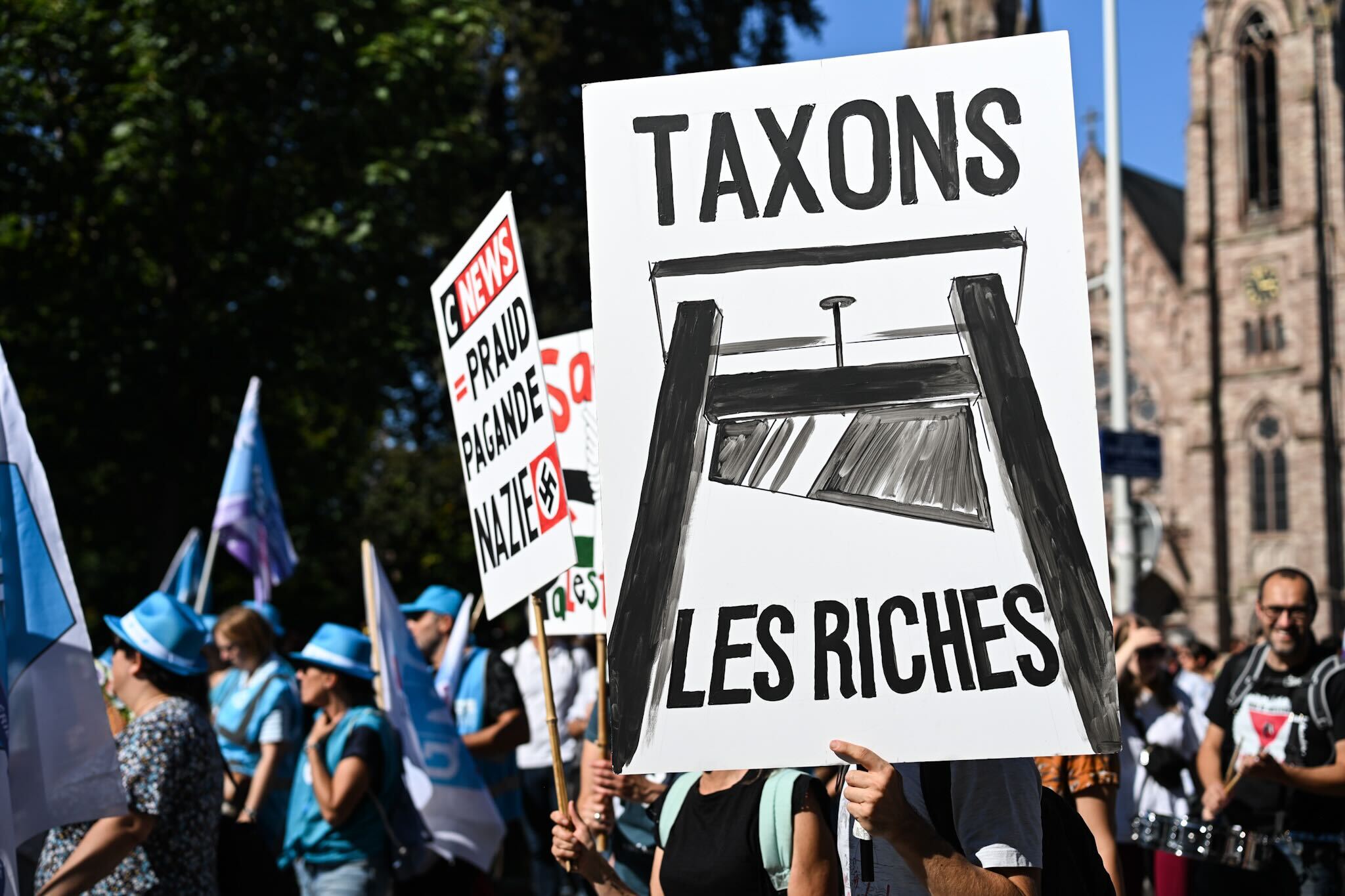 En tête de cortège, neuf syndicalistes – un représentant de chaque syndicat – portent la banderole : « Les sacrifices pour le monde du travail : ça suffit ! »