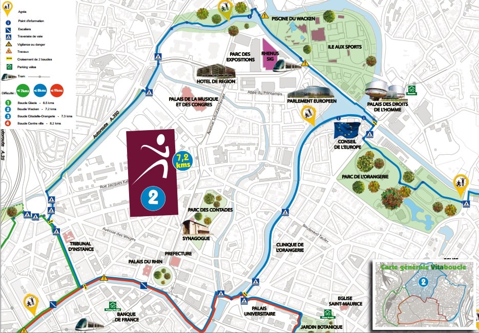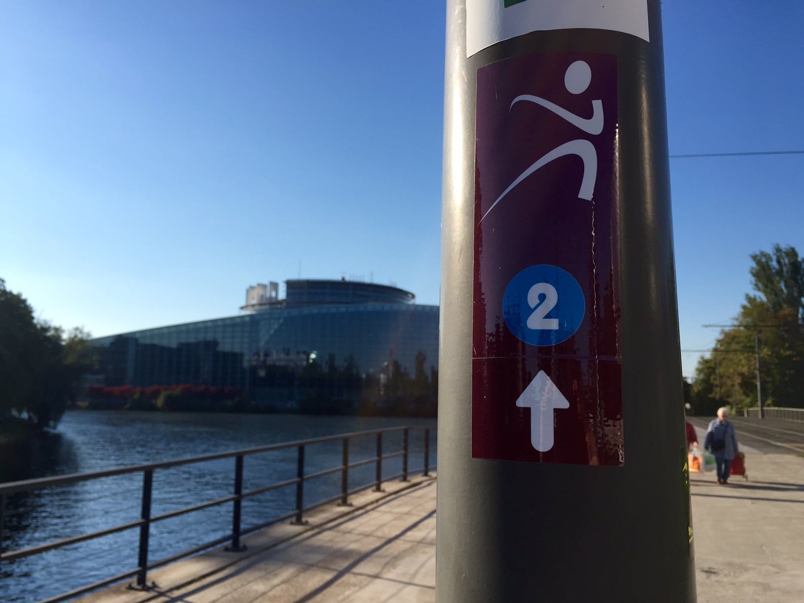 Avant de me lancer, j’étudie le plan des Vitaboucle disponible sur le site de la Ville: c’est une Vitaboucle très européenne dans la mesure où elle sillonne le quartier des institutions. Conseil de l’Europe, Parlement, Palais des Droits de l’Homme… là je me dis que si j’étais un touriste ou simplement de passage à Strasbourg et je souhaiterais courir dans la ville ou la découvrir autrement, c’est par ici que j’aimerais passer ! Pensif et courant sous une agréable mais courte éclaircie de février, je décide de me lancer en l’entamant devant le bâtiment d’Arte.