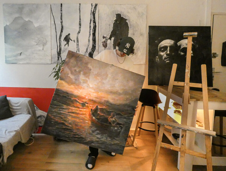 Lorsqu’Artemile peint, c’est debout et en musique. Il écoute de tout et aussi du rap français, qu’il traduit en dessin. Sur ses tableaux, les paysages côtoient ses rappeurs préférés dans un style emprunté aux impressionnistes. « J’aime beaucoup Monet et PNL », sourit le jeune homme.