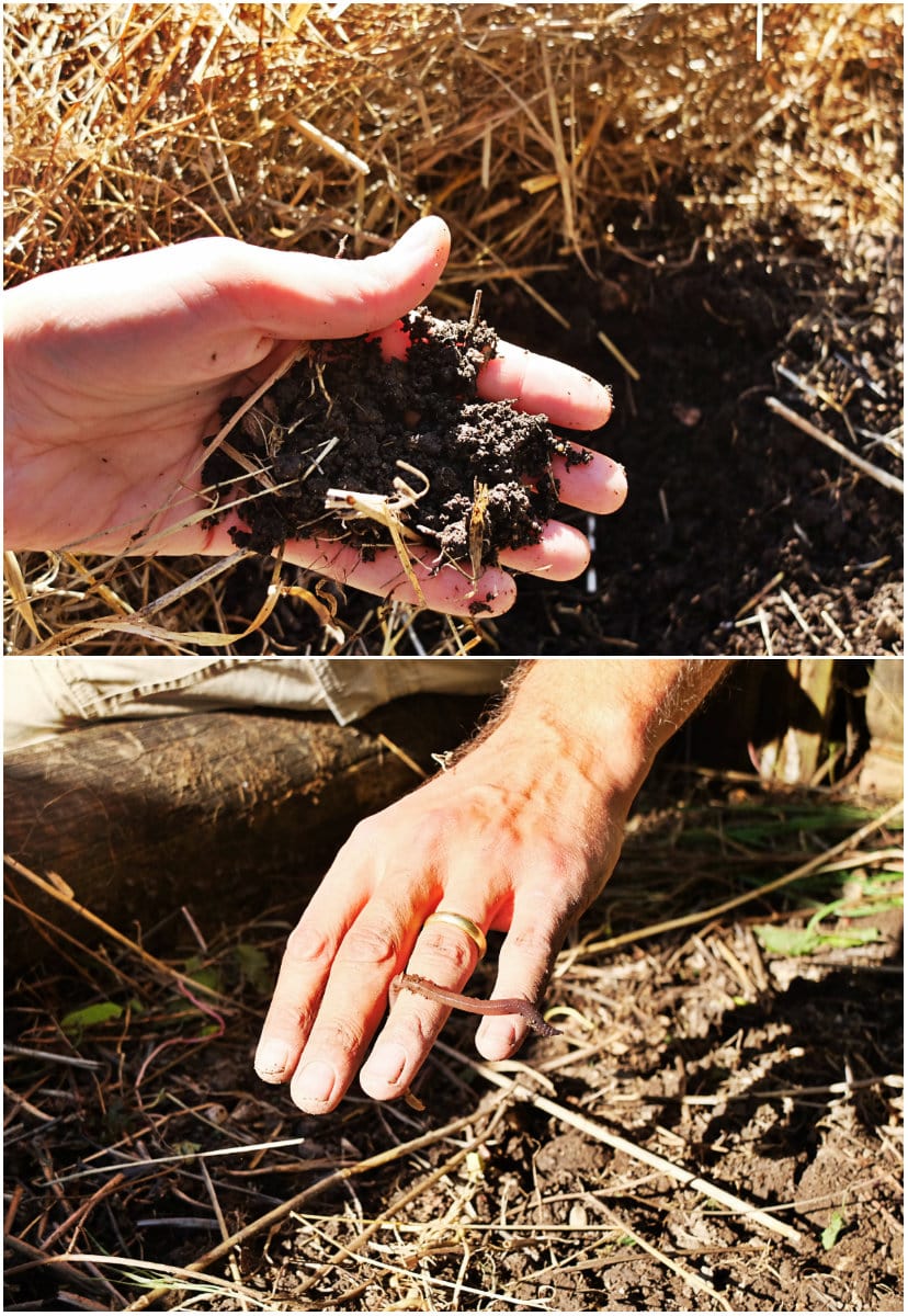 Grâce à cette couverture permanente, composée de déchets de jardin (broyat de branches, feuilles mortes, fanes – ci-dessus) ou de paille (ci-dessous), et à ces cultures d’enrichissement, la terre d’Olivier est meuble, foncée (donc riche en matière organique) et capable d’accueillir la faune du sol : verres de terre, qui aèrent naturellement la terre en creusant des galeries, insectes, champignons et bactéries, nécessaires à la bonne santé des plantes, sans produits chimiques ! Mais attention, prévient Olivier :