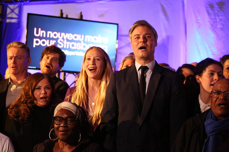 Quand la Marseillaise retentit, la salle se lève d’un bloc pour chanter. À l’extérieur pourtant, la fin de la campagne reste incertaine. En moins de 24 heures, Jeanne Barseghian s’est alliée à Florian Kobryn. Catherine Trautmann a conclu un accord avec Pierre Jakubowicz, le candidat d’Horizons qui n’a pas passé le second tour, au prix de la perte de soutien de leurs partis. Des choix qui lui permettent, lui qui s’est refusé à toute alliance au second tour, de cultiver une image polie. Mais dans la salle de la Bourse, mardi soir, Jean-Philippe Vetter a choisi de faire comme si cela lui importait peu. Il a voulu raconter la suite. Une campagne déjà dépassée… Et une victoire déjà écrite.