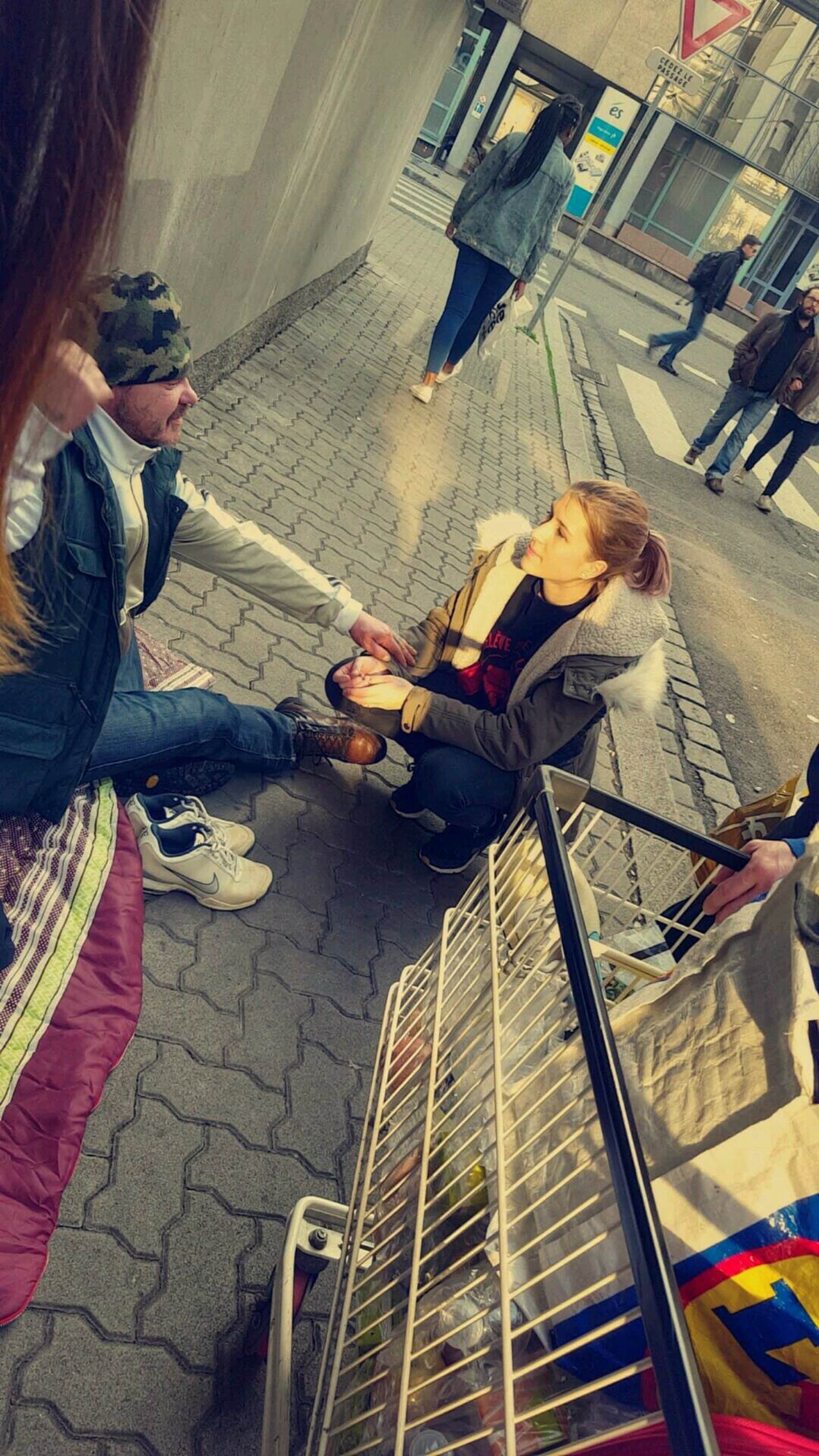 Puis, ils s’arrêtent cent mètres plus loin près de deux silhouettes allongées, emmitouflées sous des couvertures. L’une des filles s’approche et sort un petit sac en plastique contenant une bouteille d’eau, un jus de fruit, une pomme et un pain chocolat.