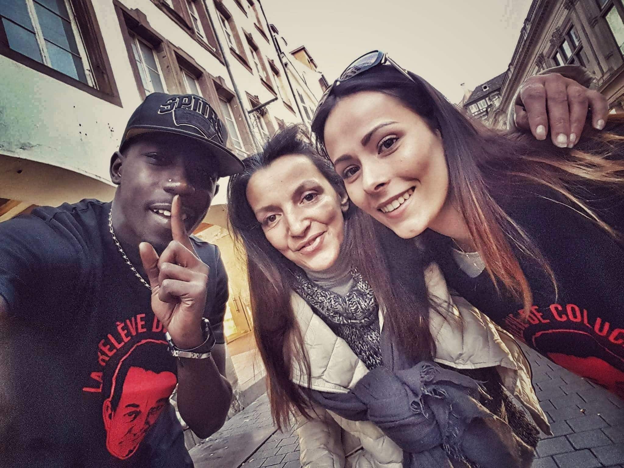 À la sortie du parking des Halles à Strasbourg, mercredi 15 mars vers 16 heures, un quatuor de jeunes dénote dans l’atmosphère un brin sinistre du lieu. Affublés du même t-shirt noir à l’effigie de Coluche, ils avancent, sourire aux lèvres, avec deux chariots de courses bien remplis, vers le fond de la rue de l’Ancienne Gare.