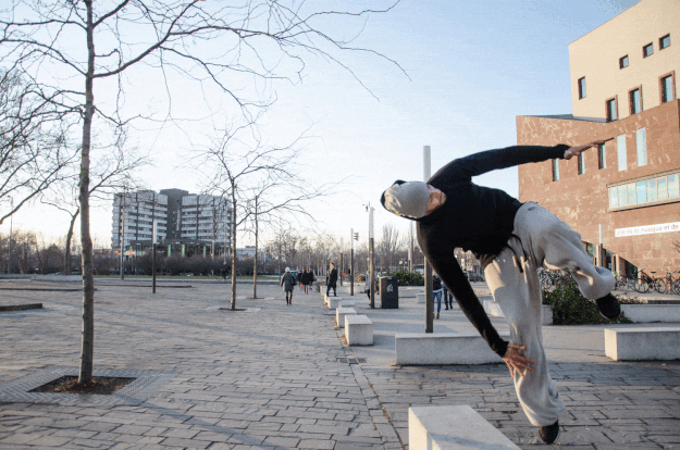 Sous un ciel couvert, les bourrasques glaciales s’engouffrent entre les rues de Strasbourg et balaient la surface de l’eau près du centre commercial Rivétoile. Au dessus du bassin Malraux, Jihane Dehbi, jogging large et sweat à capuche, joue les funambules sur la rambarde. Après un instant de concentration, il bondit sans élan d’un bord à l’autre du pont dans un saut de précision de quasiment trois mètres. Simple entraînement de routine, malgré l’air surpris de quelques spectateurs.