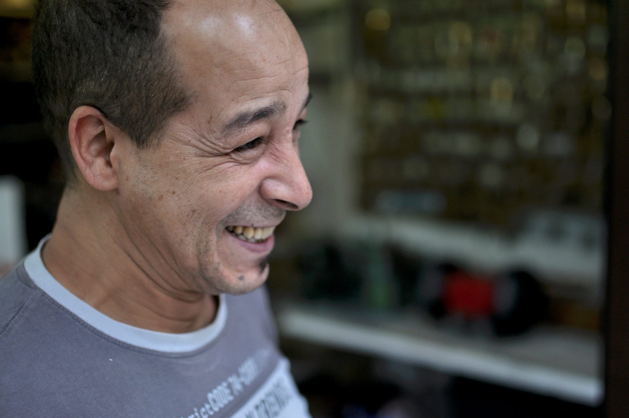 « Je n’aime pas trop la cordonnerie, mais ce que je fais à côté oui. Je râle un peu sur le coup, mais j’aime bien qu’on me ramène de tout. J’aime bien qu’on me dérange. La cordonnerie au début je m’y intéressais, mais ça devient monotone et prise de tête. Des fois, les gens me demandent des trucs vraiment bizarres. J’ai déjà eu une cliente qui m’a amené son magnétoscope… Et puis d’autres veulent que je passe chez eux pour réparer leur machine à laver, une montre ou un réveil. Je leur fais des blagues mais j’adore ça. »
