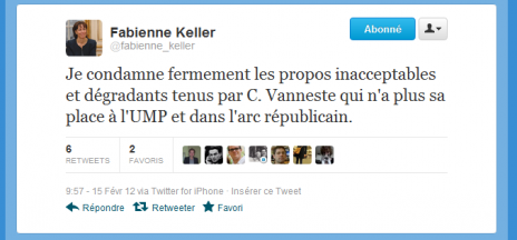 Les propos de Christian Vanneste, député UMP du Nord, niant la déportation des homosexuels pendant la guerre ont fait réagir Fabienne Keller sur Twitter. La sénatrice UMP du Bas-Rhin estime que ces propos sont « innaceptables » et que Christian Vanneste « n’a plus sa place à l’UMP ».