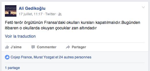 « Il faut que les écoles de l’organisation terroriste FETÖ en France soient fermées. A partir de ce jour, les enfants étudiants dans ces écoles sont suspects. »