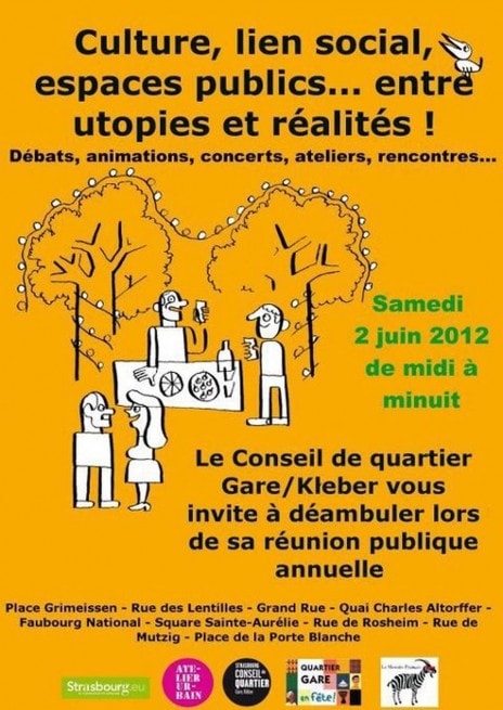 En plus de la fête de quartier, la réunion publique annuelle de Conseil de quartier Gare/Kléber a pris cette année une forme originale ! Quatre lieux du quartier vont être investis de 12 heures à 17 heures : place Grimeissen, square Sainte Aurélie, plateforme du Faubourg national, et… terrasse du Kitch’n bar