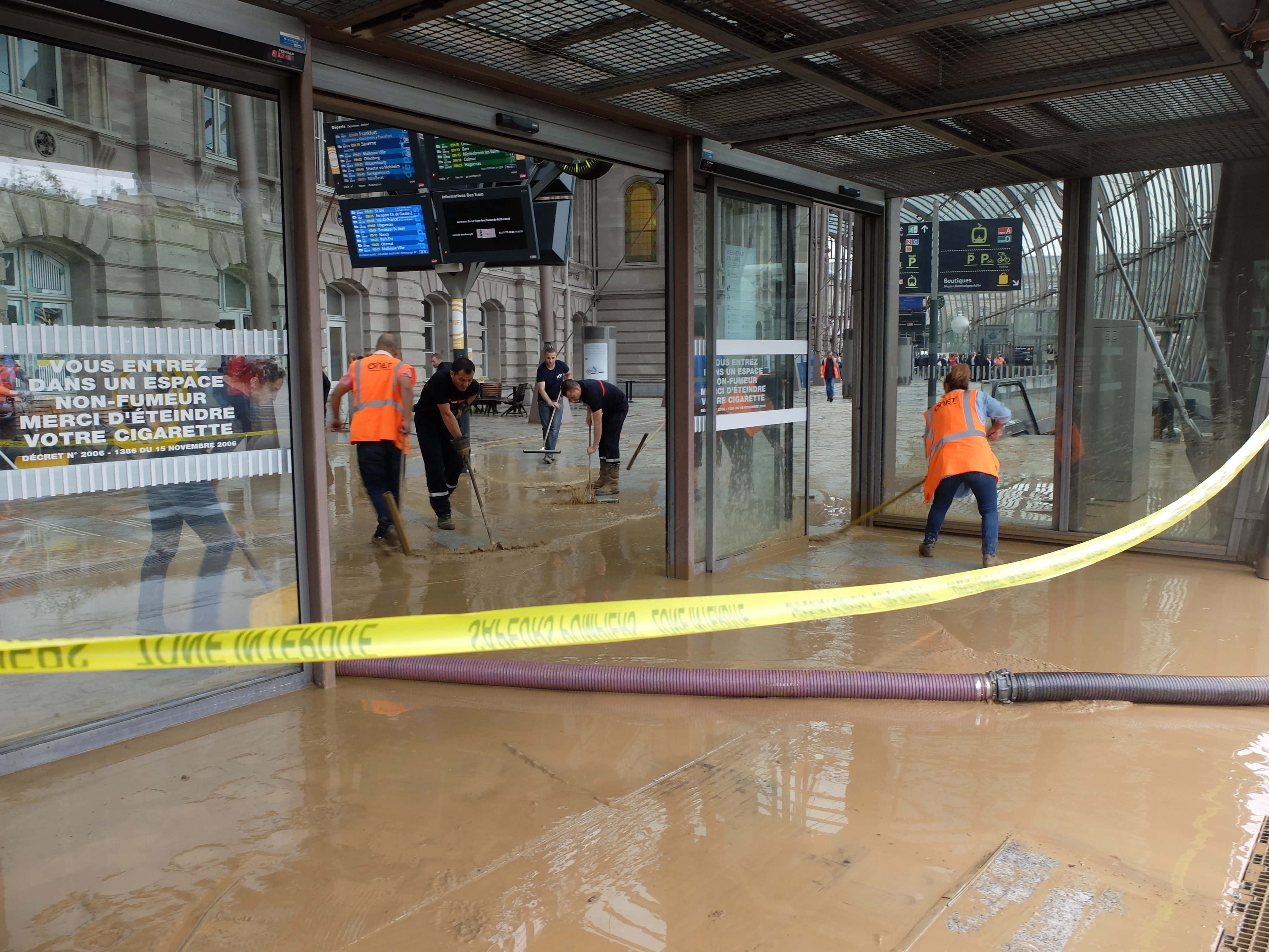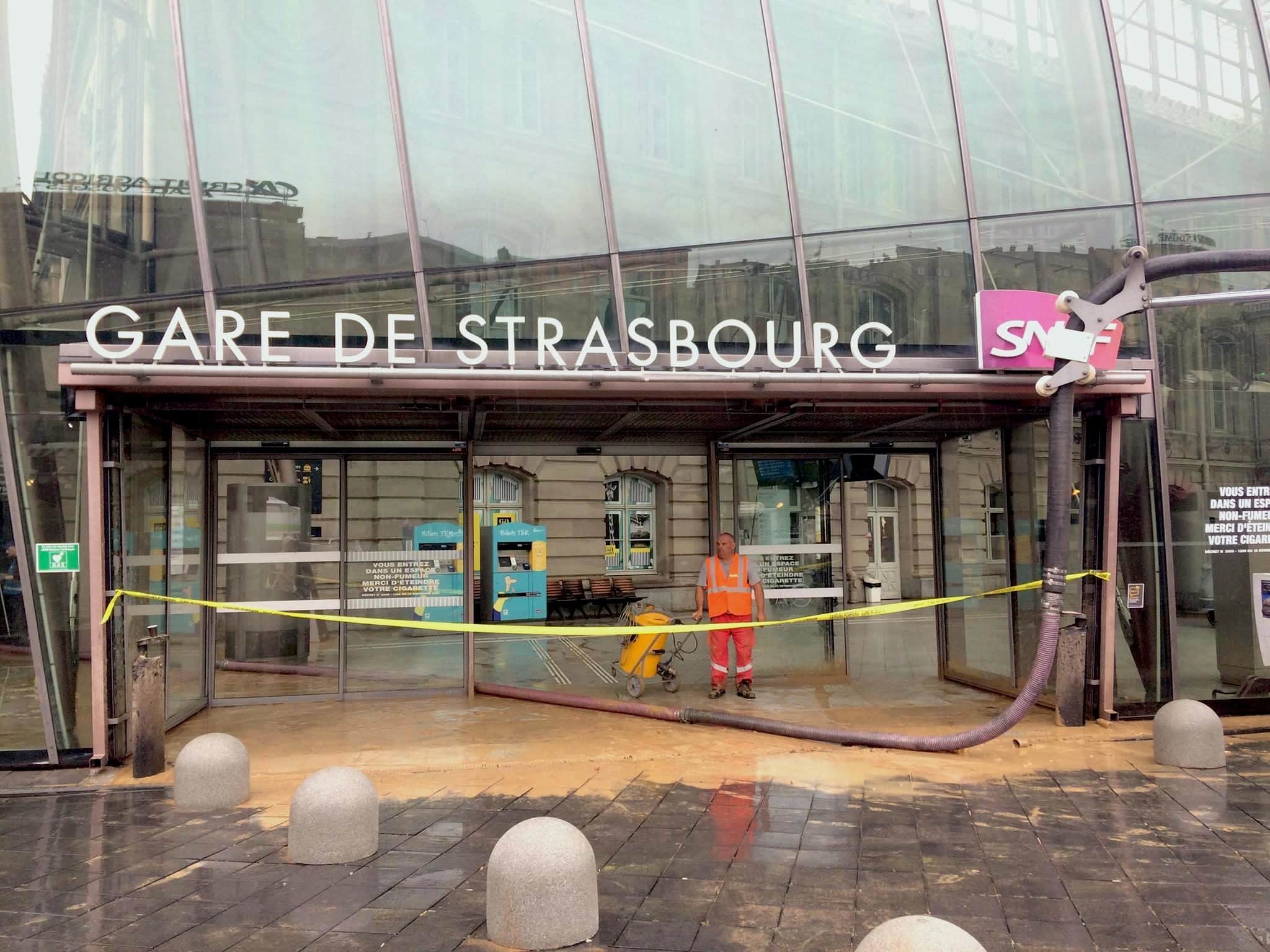 La gare de Strasbourg est sous les eaux depuis 6 heures ce jeudi 10 août, suite à la rupture d’une canalisation publique sur le Boulevard de Metz, à une cinquantaine de mètres au sud de la gare. Les raisons de cet incident ne sont pas connues à l’heure actuelle.