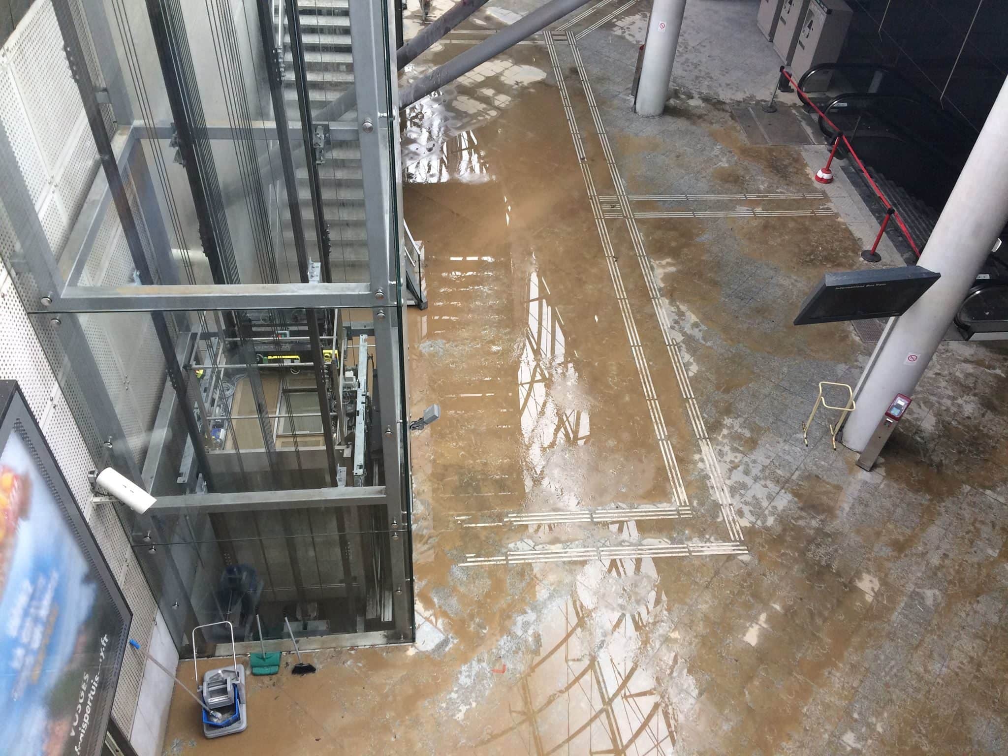 L’accès côté sud est fermé pour permettre aux différents services d’évacuer l’eau. Les passagers peuvent rejoindre les quais par les halls nord et centre depuis 8h45. Dans un premier temps, l’accès à la gare ne pouvait se faire que par le quai numéro 1, via la parking Wodli.