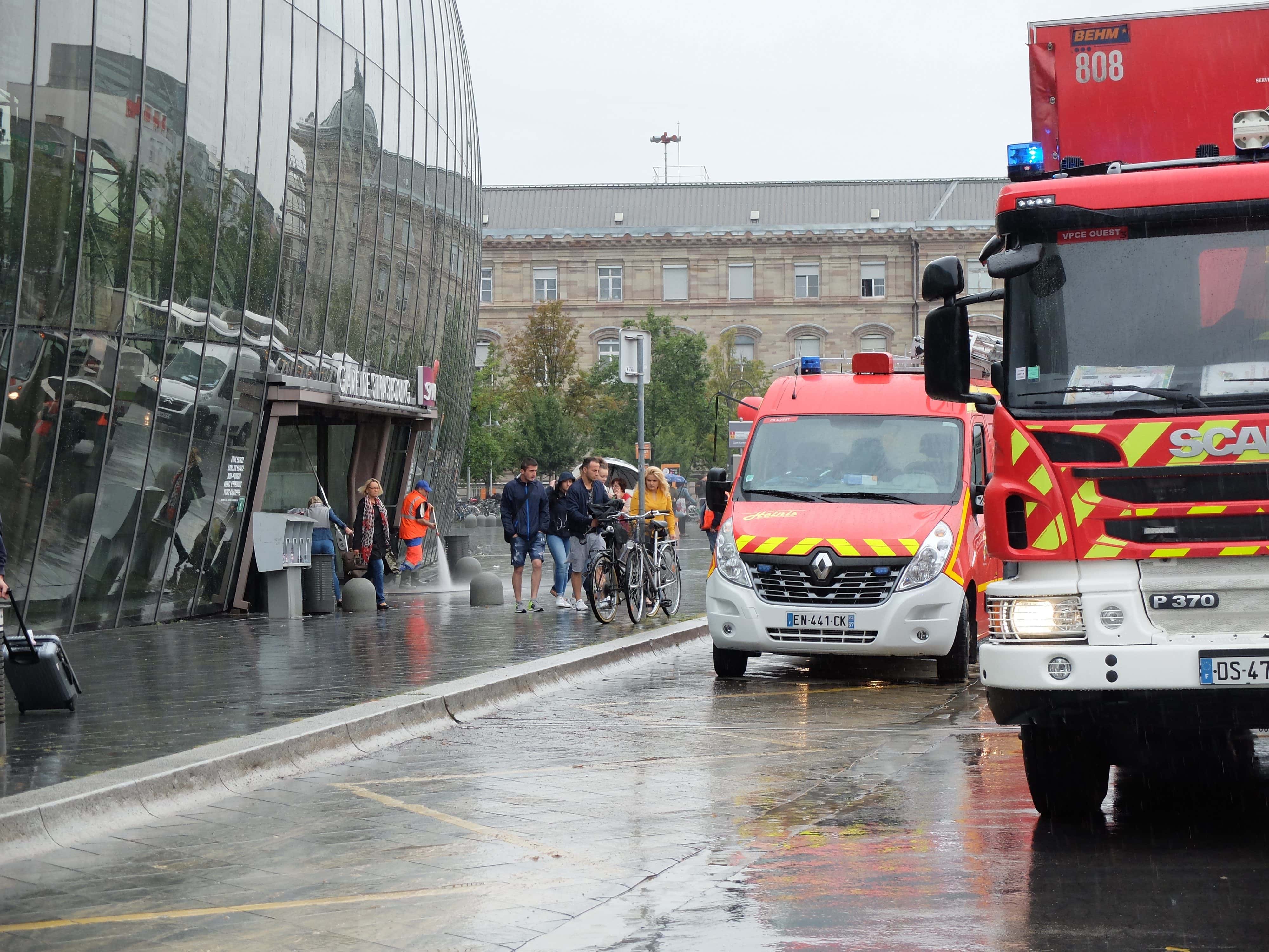 Une vingtaine de pompiers, des employés de l’Eurométropole, d’autres d’une société de nettoyage et quelques gendarmes étaient présents sur les lieux pour contenir l’inondation et évacuer l’eau présente dans le hall sud et à l’étage inférieur de la gare. Une fois l’origine de l’inondation détectée, les pompiers ont coupé l’eau, ce qui a limité le niveau de l’eau.