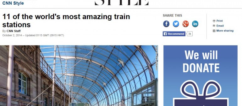 Le site de la chaîne d’information américaine CNN publie un diaporama des 11 gares les plus incroyables au monde. Seule gare française à apparaître dans ce palmarès improbable, la gare de Strasbourg figure en septième place. La station ferroviaire alsacienne est décrite ainsi : « Un gigantesque auvent de verre recouvre la façade des années 1880, ce qui donne à la gare l’apparence d’un bijou éblouissant depuis l’extérieur ».
