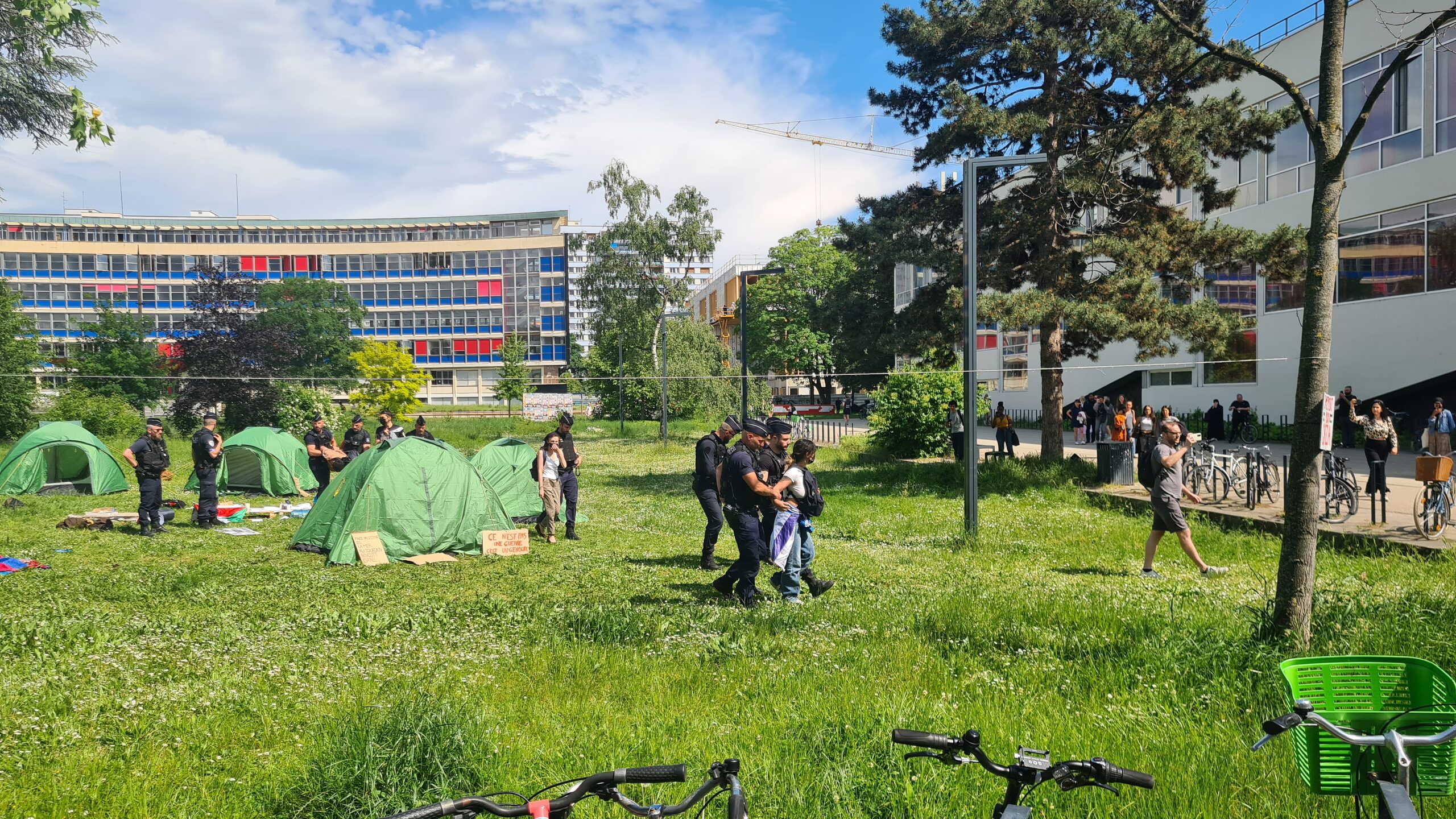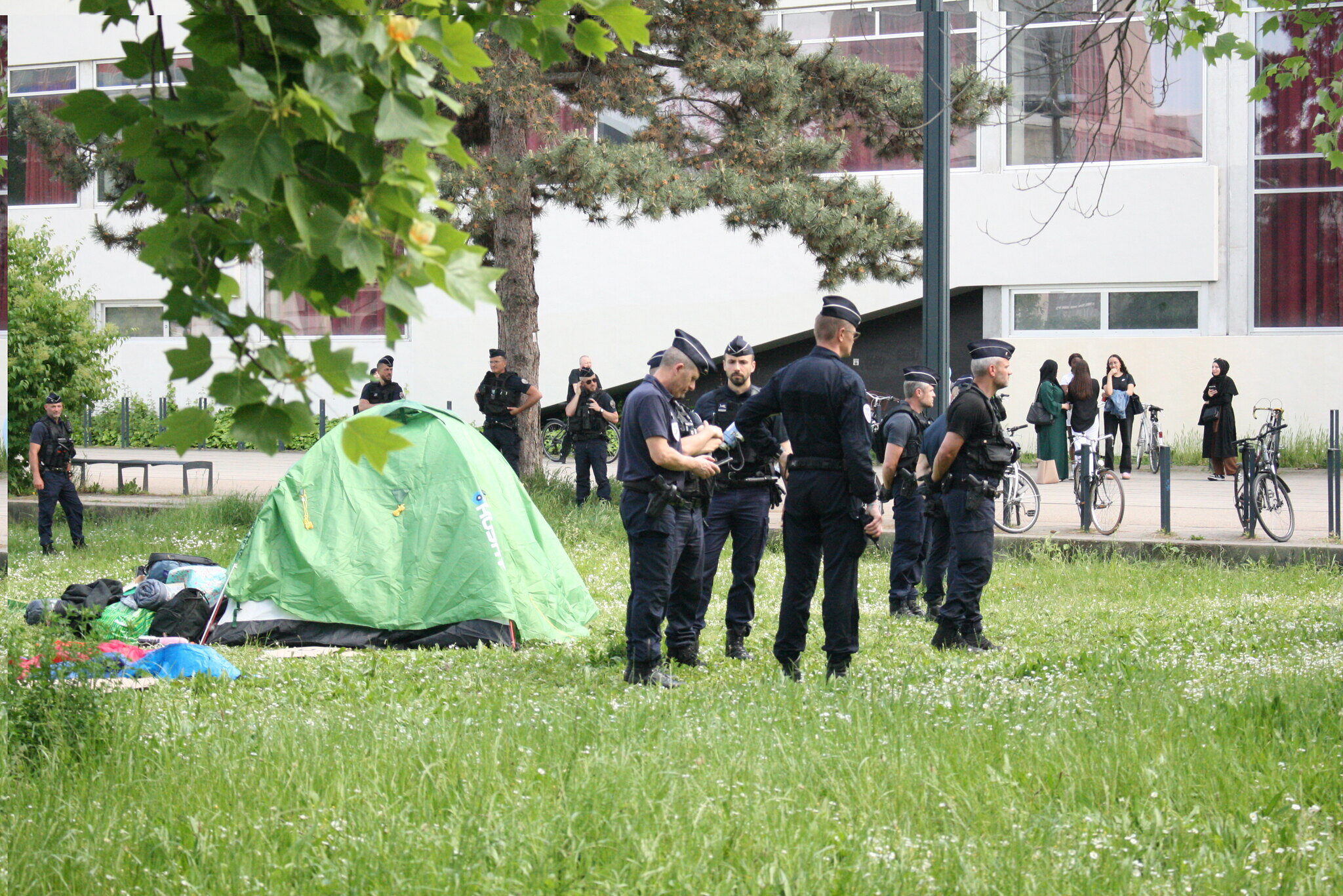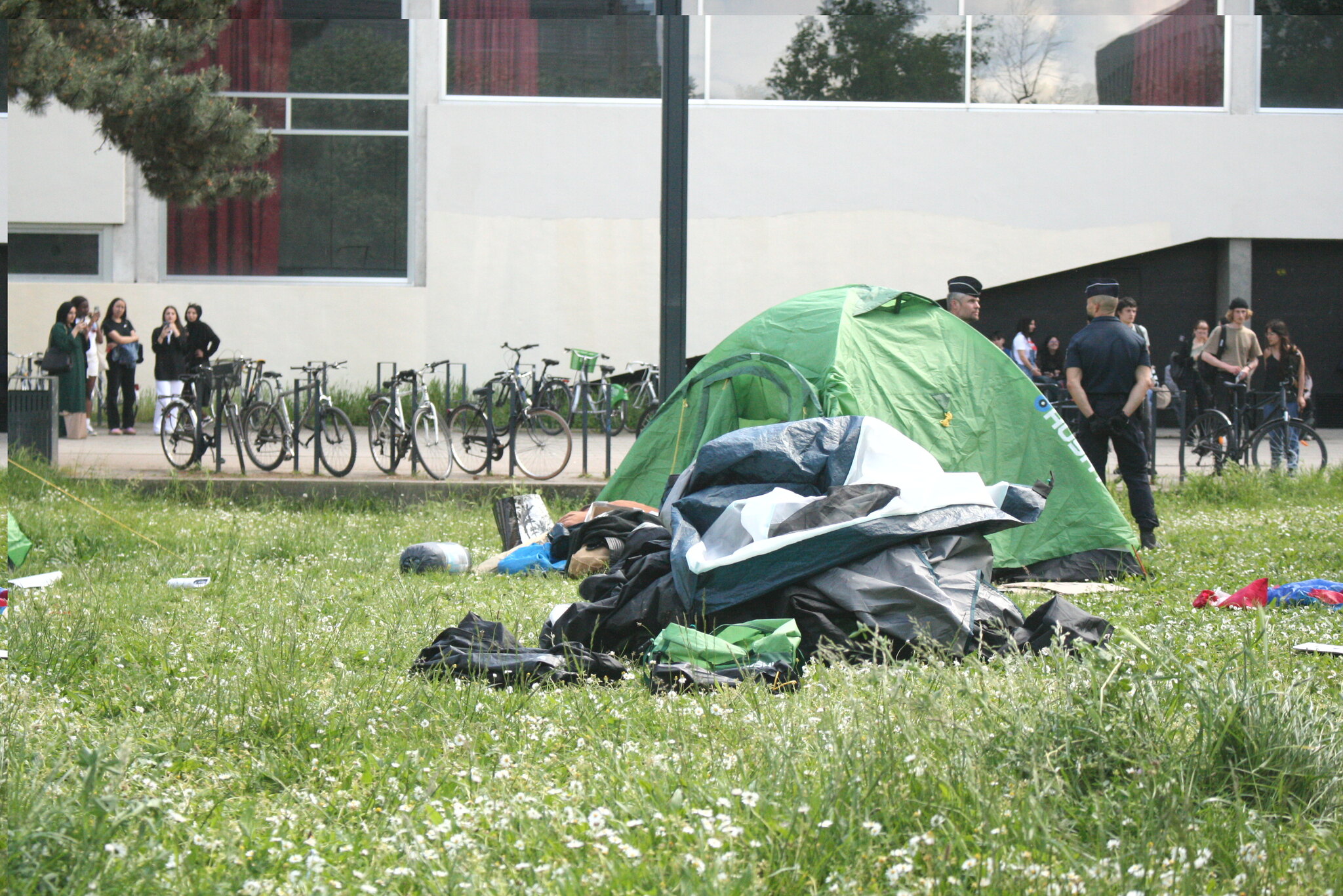 Près d’une trentaine de policiers qui sont intervenus pour évacuer le campement. Ils ont dû porter certains militants. De nombreux étudiants présents ont été mis à l’écart afin de procéder à des contrôles d’identité. Pendant ce temps, plusieurs agents de l’Université ont procédé au démontage du camp, sous la surveillance des policiers présents. Les affaires personnelles des étudiants ont été rassemblées et déplacées dans un des bâtiments à proximité.