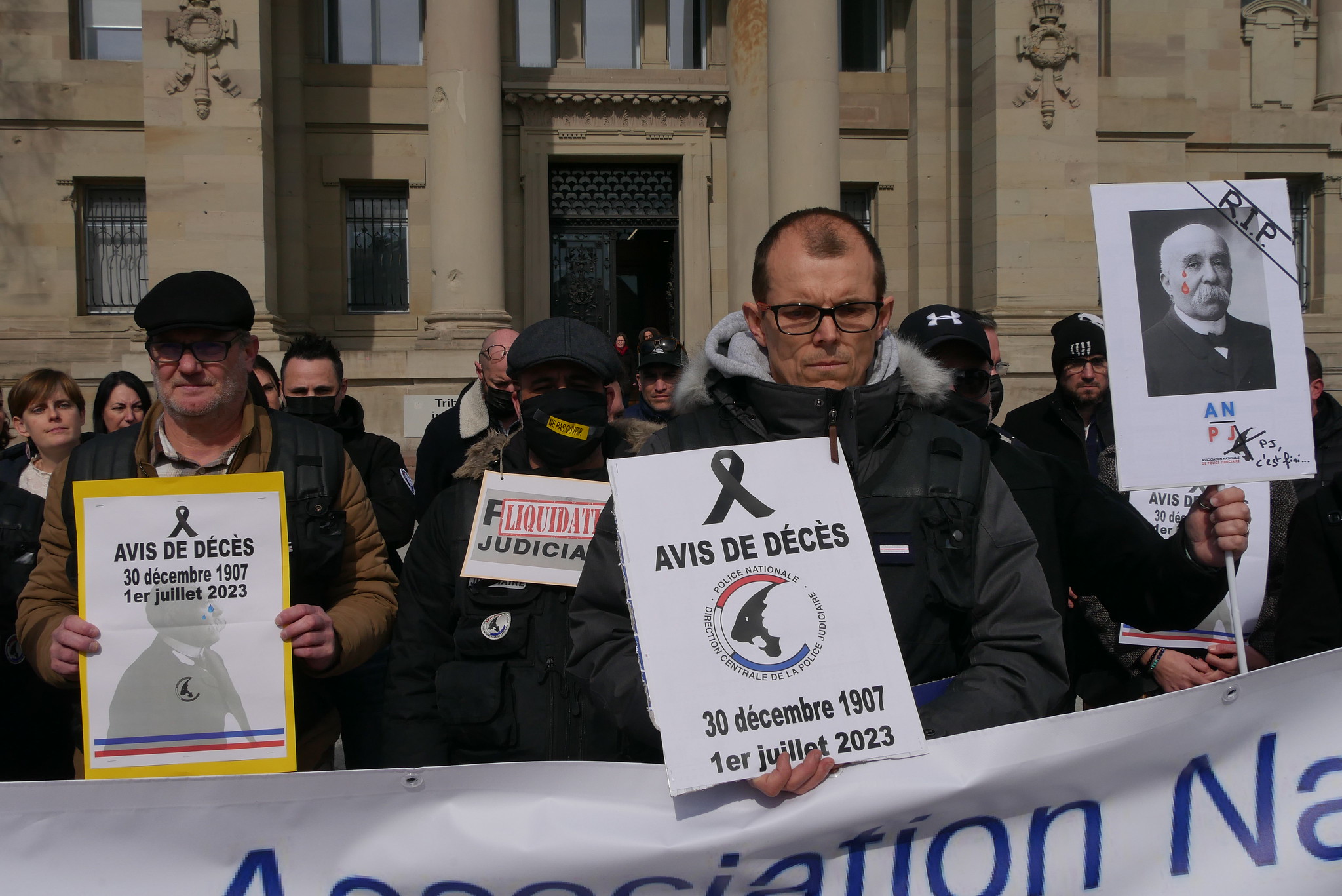 À Strasbourg, c’est leur troisième rassemblement depuis le mois d’octobre 2022. « Mais aujourd’hui, ce sera sans doute le dernier », soupire Michel Thomas, Major de police de 56 ans. « Je suis entré à la PJ de Paris en 1990 et à celle de Strasbourg en 96. La PJ, c’était pour faire de belles enquêtes, arrêter des voyous. Aujourd’hui cette réforme nous supprime en tant que tels. » L’enquêteur est ému. Lorsqu’il lit au micro le discours du rassemblement, sous la bannière de l’Association nationale de police judiciaire (ANPJ), sa voix tremble un peu. Et ses collègues le soutiennent, comme ils peuvent.
