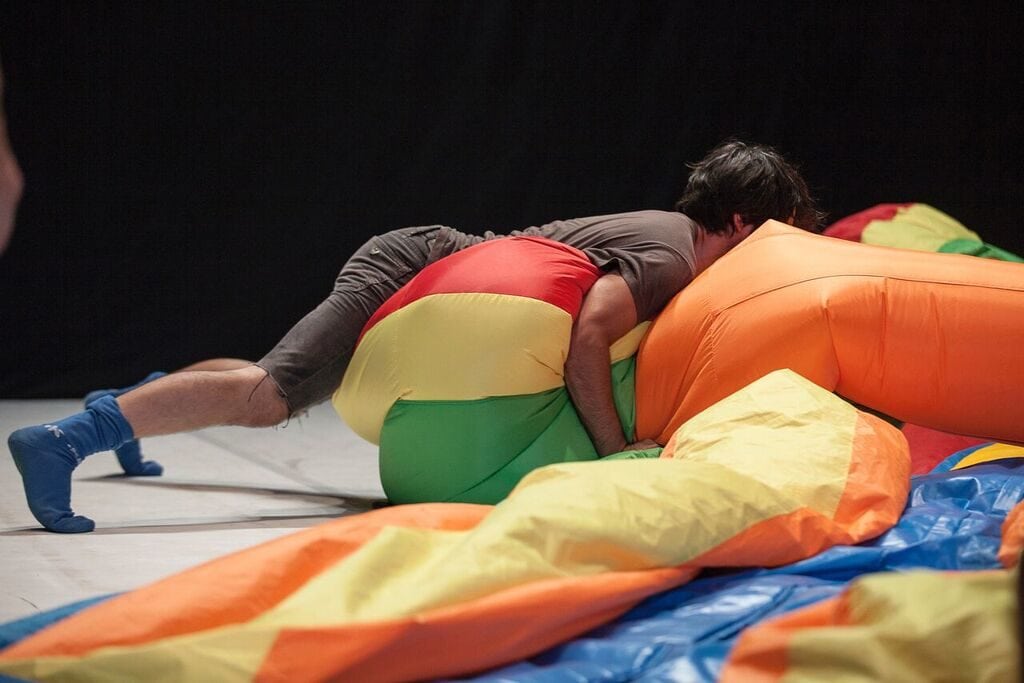 Pour La Possibilidad… la compagnie mêle une fois encore les genres en les démarquant les uns par rapport aux autres. Sur cette cartographie de l’Europe d’aujourd’hui viennent se greffer une voix off, féminine, et quatre acteurs, muets. Les quatre comédiens évoluent sur une scène quasiment vide où seuls quelques objets sont disposés pour les divertir : sacs plastiques, gong, château gonflable, etc. Leurs actions paisibles semblent en complet décalage avec le texte récité par la voix-off. Ainsi, la scène fonctionne en autonomie du texte: les acteurs restent muets aux paroles qui se déroulent, leur expression livide. Le spectateur, lui, doit sonder ce vide entre texte, corps et image, confronter ces éléments pour trouver du sens. Selon la compagnie :