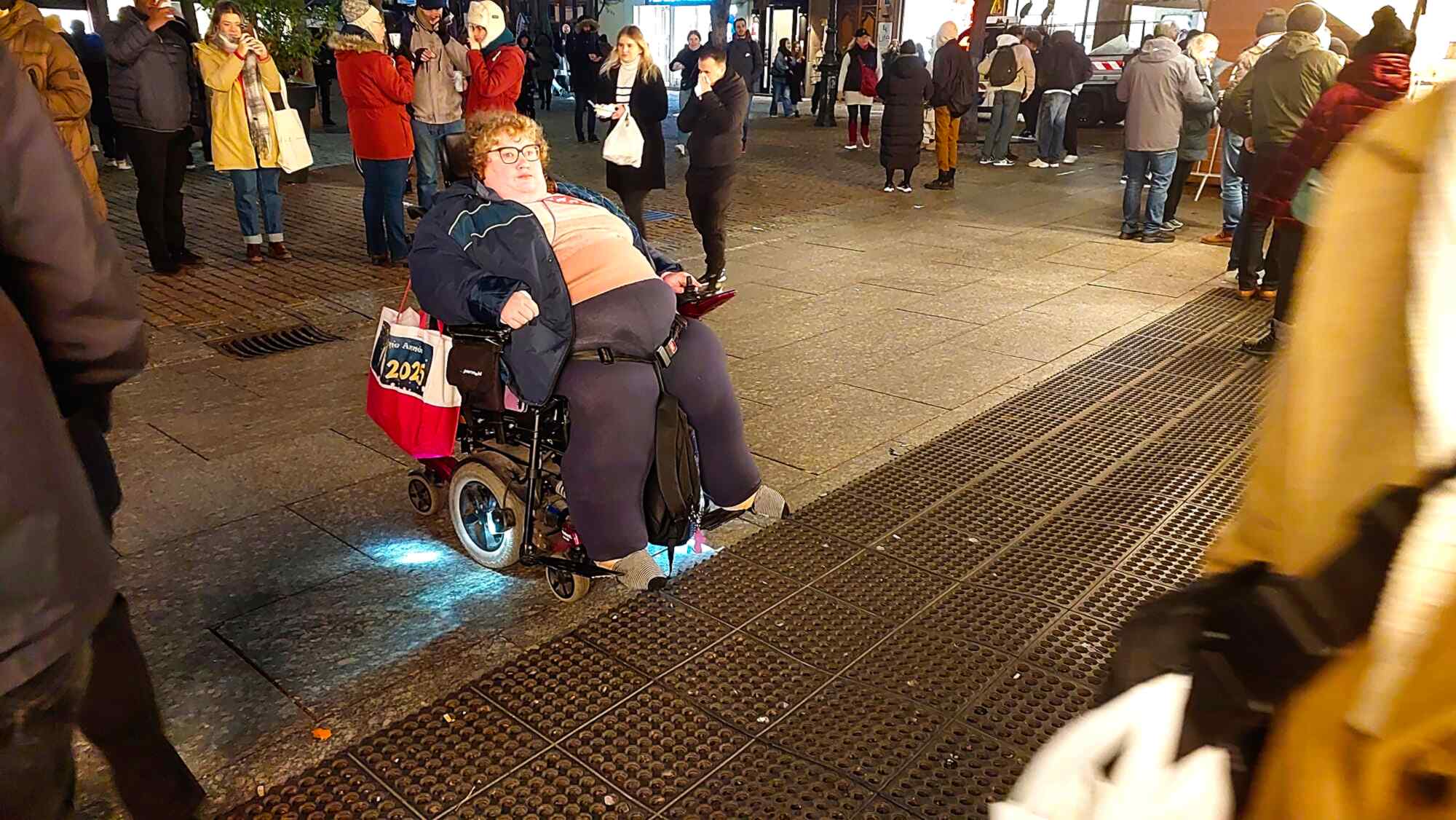 Un peu plus loin, l’allée du marché de Noël qui se trouve vers l’Aubette est recouverte d’un tapis en caoutchouc de plusieurs dizaines de mètres. Un énième détail qui m’avait échappé, à moi visiteur valide, mais qui se transforme en véritable épreuve olympique pour la personne en situation de handicap et pour son accompagnant. Les roues ne répondent plus correctement, le pilotage devient très complexe, voire impossible sans aide extérieure. « Ouf, on arrive au bout », lâche Lætitia alors qu’on s’approche du tram.