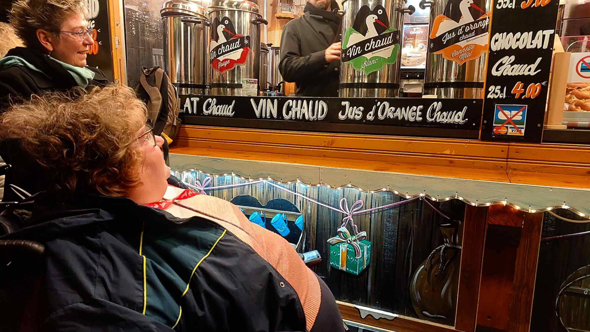 Pour récupérer son gobelet fumant, Lætitia doit se mettre de côté, puis faire marche-arrière, pour que son bras soit le plus proche de la caisse… « Je vais vous aider », lance une cliente en lui transmettant la boisson. Une fois nos deux verres reçus, je m’élance pour continuer notre chemin, mais Lætitia m’arrête. Elle ne peut pas boire et rouler en même temps sur les pavés. On dégustera donc notre chocolat accoudés à la petite plateforme en bois qui court le long du comptoir. Pas de lente déambulation verre (chaud) à la main tout en admirant les lumières de Noël pour nous.