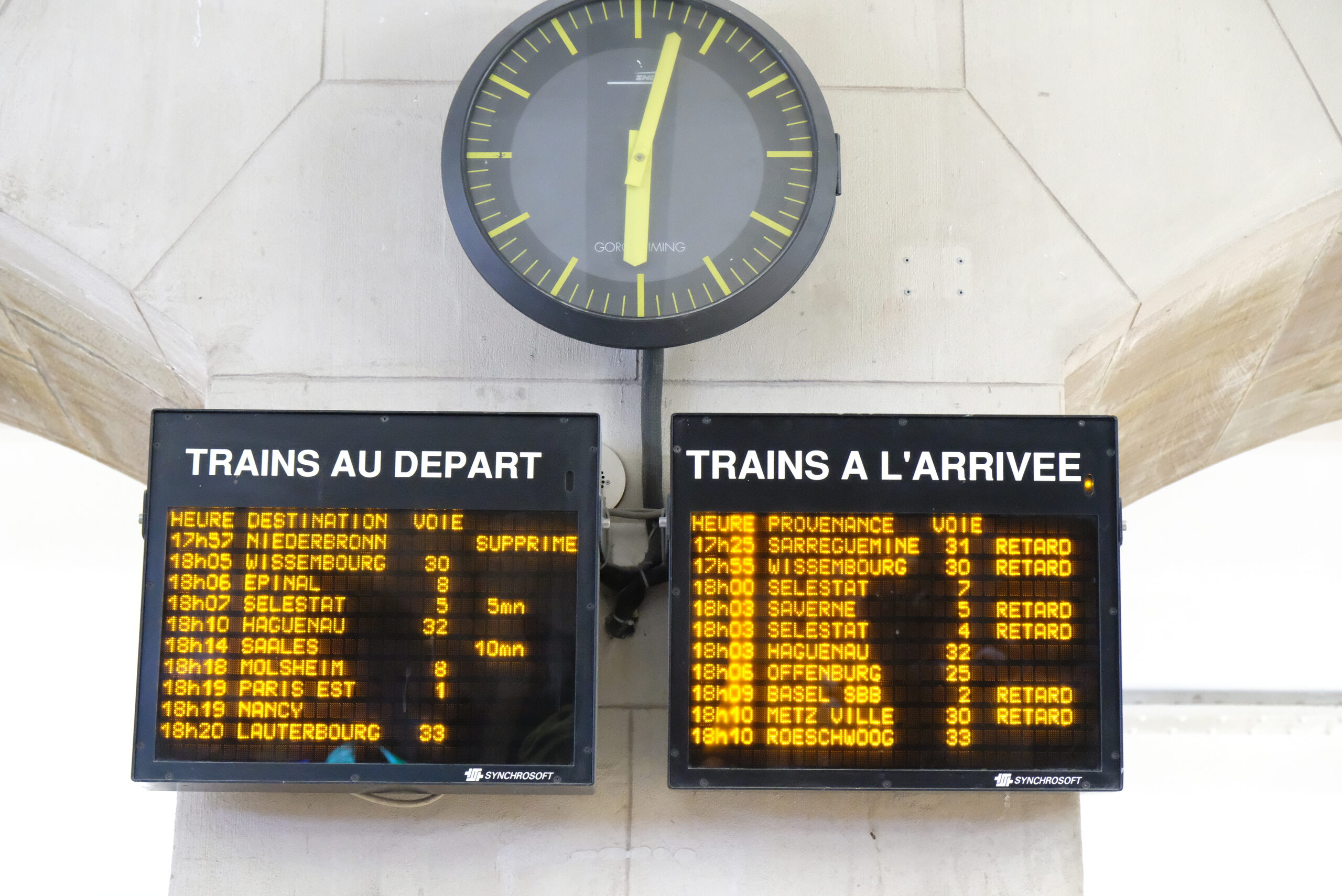 De retour à Strasbourg, la gare gronde des voyageurs en colère. Les annonces se suivent et se ressemblent : « Le train de 17h58 en direction de Bâle est supprimé en raison de la réutilisation d’un train. » Sur les panneaux des départs et des arrivées, le train pour Niederbronn de 17h57 affiche d’abord cinq minutes de retard, puis il est supprimé. Les trains pour Wissembourg, Bâle et Metz sont aussi affichés avec du retard.