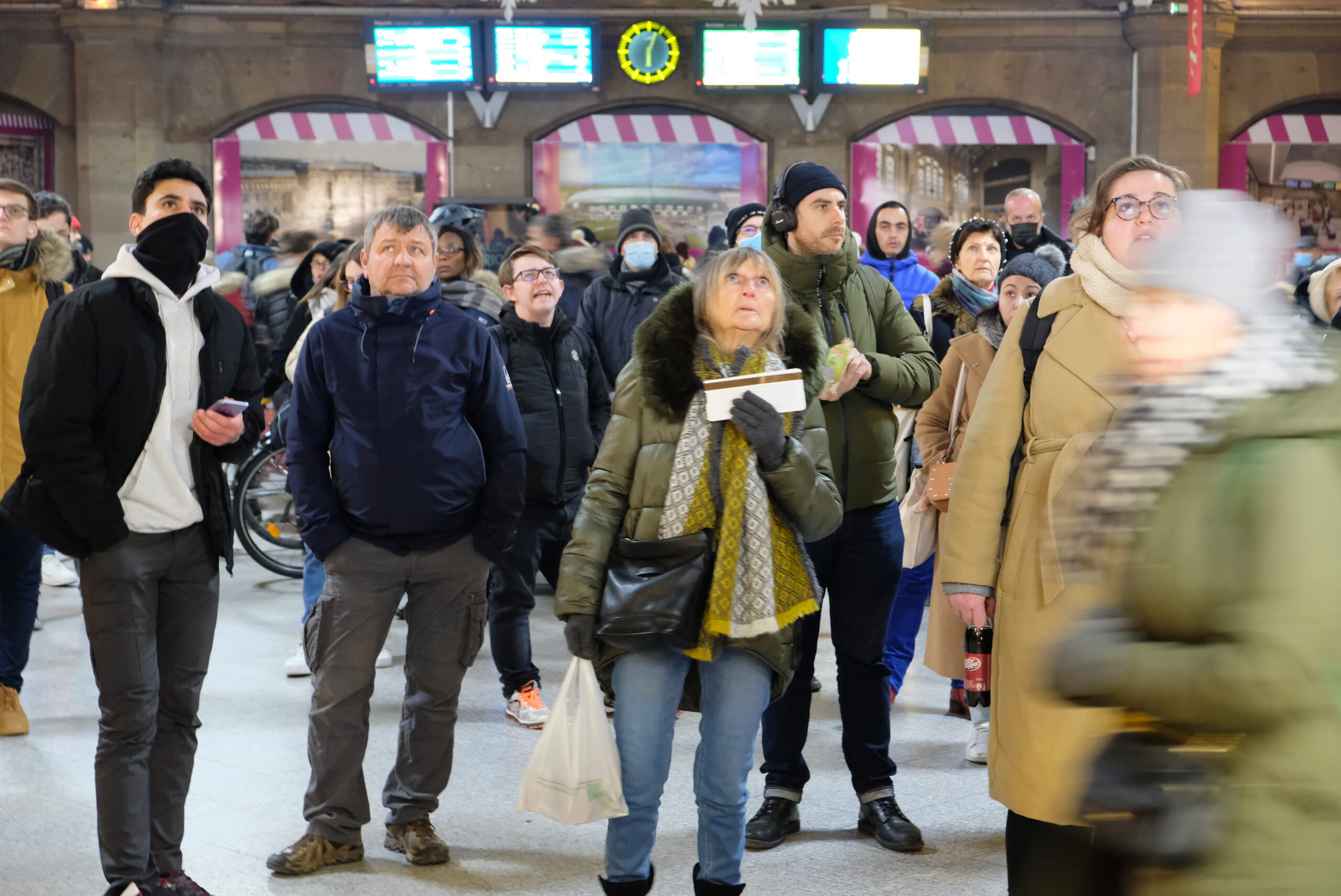 Des dizaines de personnes ont les yeux rivés sur un tableau d’affichage ponctué de plusieurs retards et de suppressions de trains. La foule commence à s’impatienter. Un petit groupe d’agents de la société ferroviaire doit traverser le hall central pour rejoindre le quai numéro 1. À peine ils s’élancent qu’une voyageuse alpague un des jeunes en gilet rouge sans manche : « Excusez-moi monsieur, mon train pour Colmar a été supprimé. Comment est-ce que je fais ? » Un des cheminots s’arrête. Une erreur de débutant sans doute.
