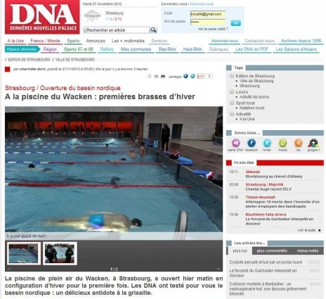 Je remercie chaleureusement la journaliste des DNA Charlotte Dorn d’avoir eu la même idée que moi, qui me permet de me débiner sans plus d’explication que « ça a déjà été fait » ! Ce matin dans l’édition locale strasbourgeoise de ce quotidien régional, la journaliste raconte ses premières brasses dans le bassin nordique du Wacken, tout juste rouvert le 26 novembre 2012, après un beau succès de fréquentation pour les parties extérieures cet été (notre article paru en juin).