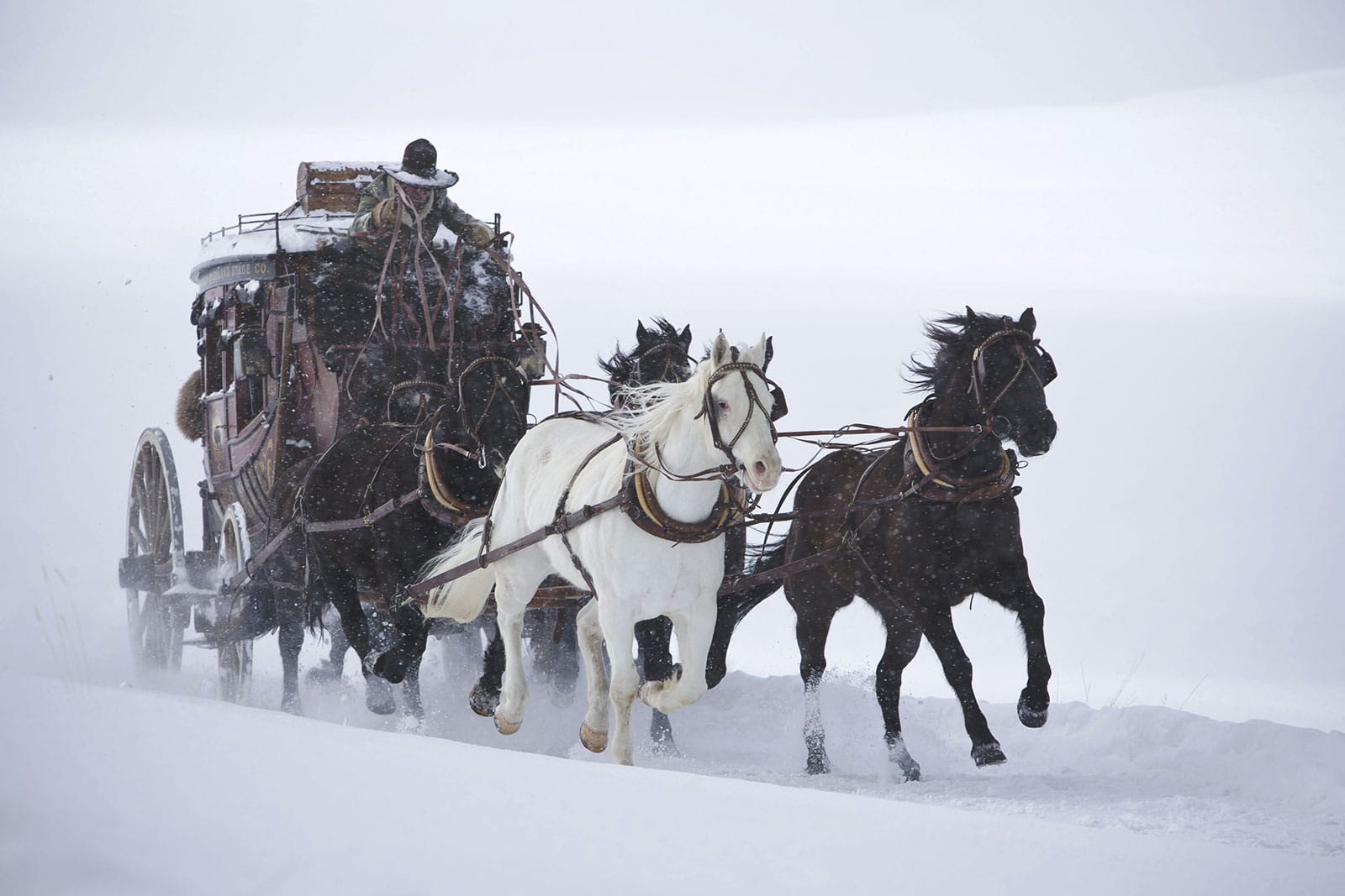 Le blizzard est le premier protagoniste de ce faux thriller, dont l’action se tient davantage dans les dialogues très théâtraux que dans les courses poursuites. Une tempête de neige fait rage, et les paysages d’une blancheur éblouissante sont traversés par un magnifique attelage de destriers de haute classe. L’art très maîtrisé de Tarantino est indéniable; chaque foulée, chaque angle de vue est calculé pour notre plus grand plaisir. La luminosité est aveuglante, le froid nous transperce, mais l’ambiance visuelle est signée d’une main de maître, et les plans sont tout simplement sublimes.