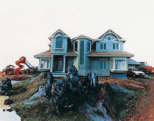 Ryuta Amae propose comme idéal d’existence plusieurs choses : tout d’abord un grand pavillon de banlieue avec de grandes fenêtres telles des ouvertures sur le monde, une voiture bien entendu mais un break pour une grande famille, il s’y trouve aussi des jeux pour les enfants (toboggan, cabane au fond du jardin, etc.), un chemin terreux dans lequel s’embourber, une jardinet avec ce qui ressemble à une mare à l’eau brunâtre mais aussi un tracto-pelle pour faire des travaux d’agrandissement parce que c’est bien connu : vivre dans une maison nécessite une entretien quasi constant. Ryuta Amae, dans ces photographies, même s’il propose un illusion, dresse un portrait sardonique du monde dans lequel on vit : un modèle du bonheur qui serait stéréotypé et transposable à chacun d’entre nous, est-ce souhaitable ou, plus simplement, est-ce viable ?