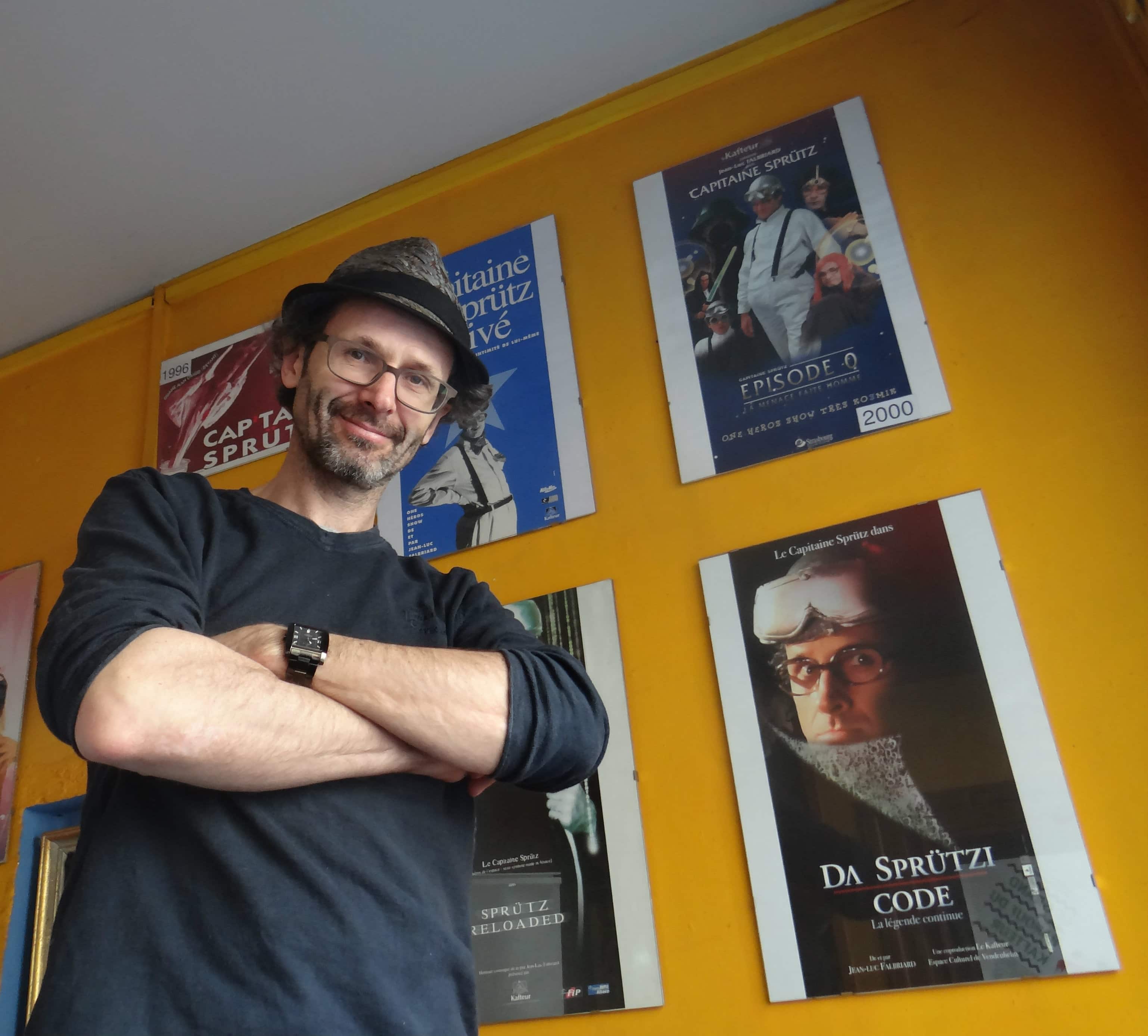 Jean-Luc Falbriard, créateur du Kafteur, pose devant son personnage, le Capitaine Sprütz, crée il y a 20 ans, déjà. (Photo T.T / Rue89 Strasbourg)