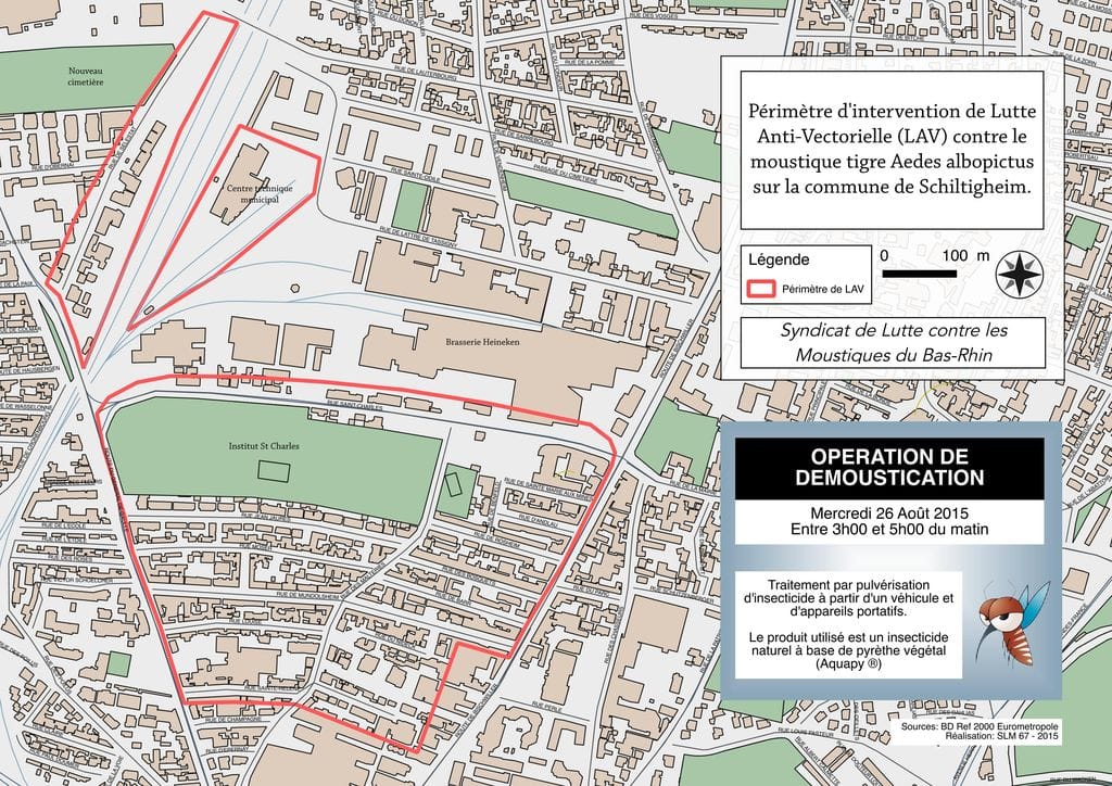 La progression inexorable du moustique tigre depuis le sud de la France a atteint Strasbourg, puisque des larves de cet insecte d’origine asiatique ont été repérées à Schiltigheim selon l’Agence régionale de santé (ARS). Plusieurs opérations de démoustication vont être menées sur un périmètre de 30 hectares (voir la carte plus haut), le 26 août entre 3 et 5 heures du matin.