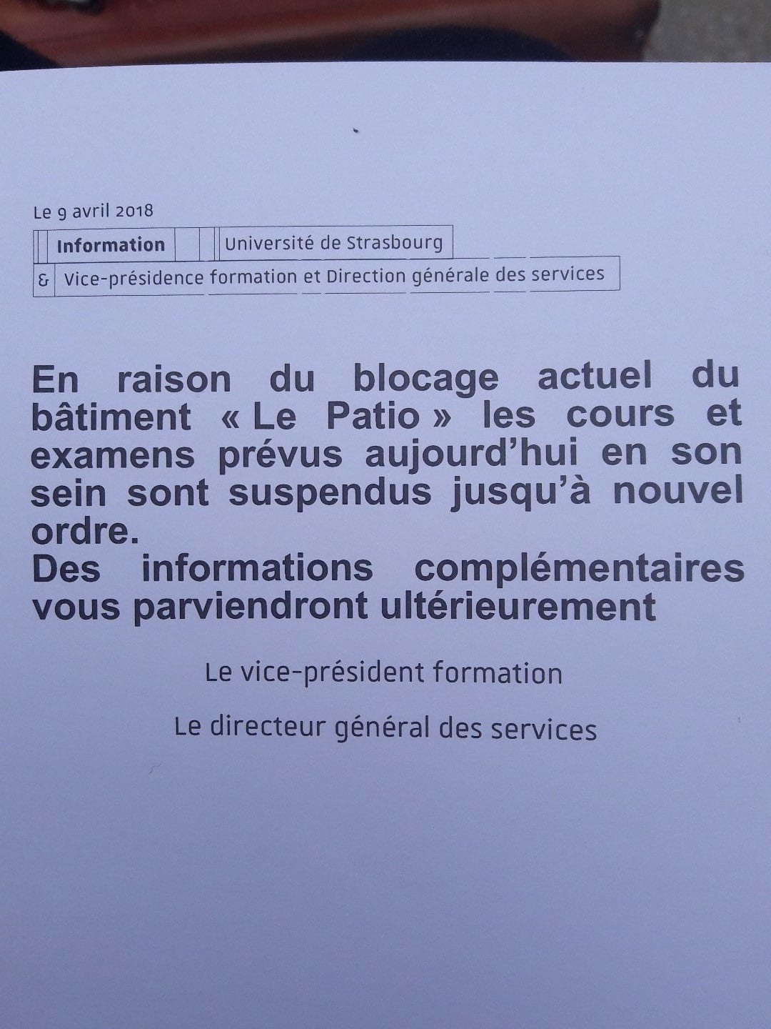 L’accès aux amphithéâtres et aux locaux administratifs du Patio et du Nouveau Patio, deux bâtiments de l’Université de Strasbourg, sont bloqués par une soixantaine d’étudiants opposés à la réforme de l’université et de l’orientation post-bac depuis ce lundi matin 8 heures.