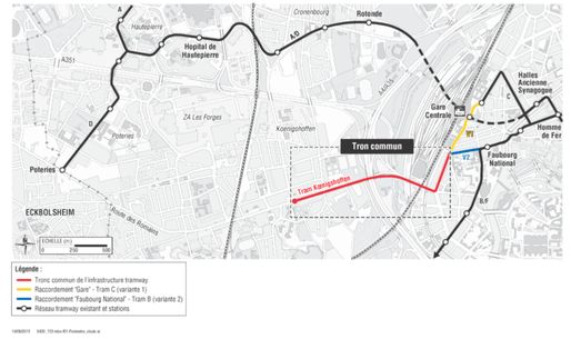 « La desserte de l’ouest peut ainsi être réalisée par la réorientation de la ligne F en direction de Koenigshoffen, sans surcharger significativement le fonctionnement du nœud Homme de Fer. Les réflexions menées depuis 2013 montrent en outre la faisabilité et l’intérêt d’une connexion via les infrastructures existantes de la ligne B (facilités d’exploitation, coût d’investissement, préservation des aménagements réalisés sur la place de la Gare, etc.) »
