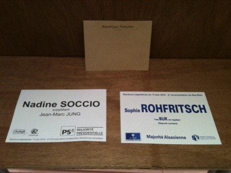 Anne Hulné, candidate dans la 1ère circonscription du Bas-Rhin, face aux résultats nationaux : « C’est la vérité des urnes, il faut la respecter. Le contexte national était difficile, le quinquennat fait que les gens saturent de la politique. Les personnes que j’ai rencontrées lors de la campagne me l’ont dit, elles en ont marre. Et ce n’est pas comme si l’UMP avait perdu 200 députés, il faut bien voir que nos députés ont été comptés individuellement, alors que ceux de la gauche sont comptés dans leur ensemble. »