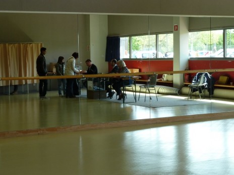 Le soleil perce timidement sur l’arrêt Dante. Malgré l’heure matinale, il y a déjà quelques personnes dans le gymnase de la maille Éléonore. Des « a voté » rebondissent sur le terrain de basket. La ligne rouge de milieu de terrain sépare les bureaux de vote n°602 et 618.
