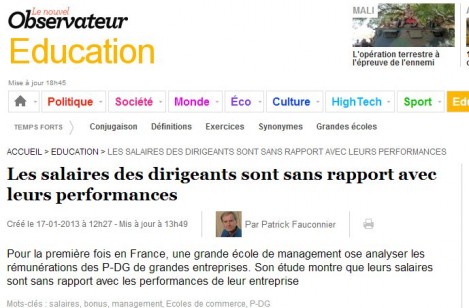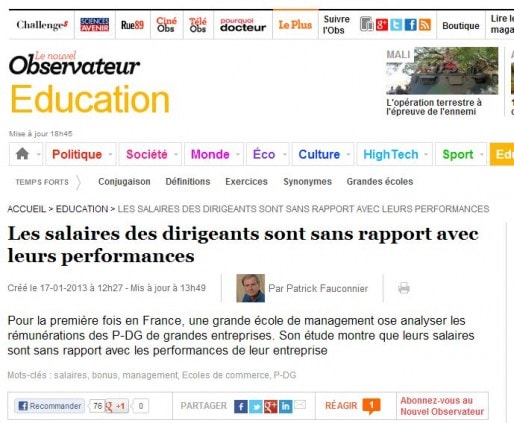 Le Nouvel Obs publie les principaux résultats d’une étude de l’Ecole de management de Strasbourg, selon laquelle : il n’existe pas de corrélation entre la rémunération des P-DG et les performances financières de leurs entreprises, un Comité des Rémunérations a plutôt pour effet de faire monter le salaire des dirigeants et la présence d’administrateurs indépendants au Conseil d’administration de l’entreprise ne garantit aucunement une modération du salaire du P-DG.
