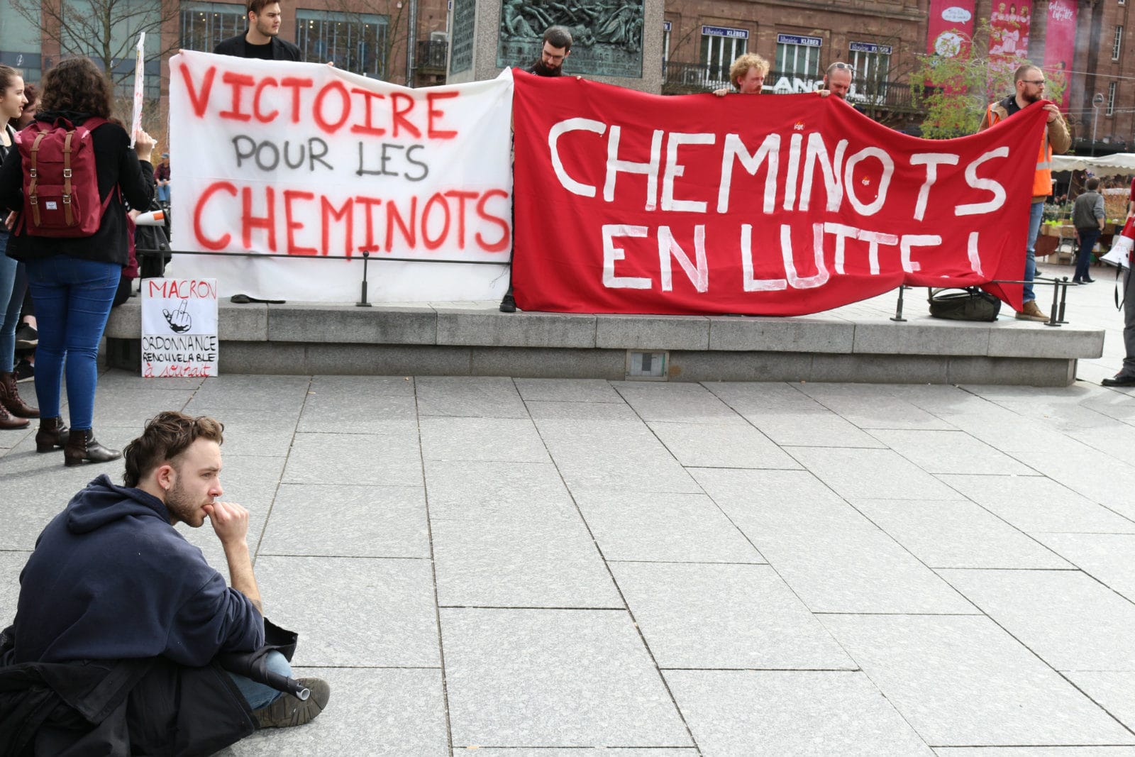 « Nous sommes tous ensemble contre le gouvernement Macron, contre la précarisation dans le milieu hospitalier et les EHPAD, la baisse des retraites. Ensemble, les étudiants concernés par la sélection et les cheminots qui se font attaquer de toutes parts. » Un étudiant brandit un microphone, mardi 3 avril aux alentours de 15h, place Kléber à Strasbourg.