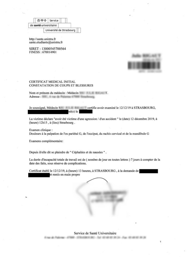 Trois personnes se plaignent de douleurs au visage. L’une d’entre elles est allée au service médical de l’université pour réaliser un certificat. « La durée d’incapacité totale de travail est de 7 jours à compter de la date des faits, sous réserve de complications. »