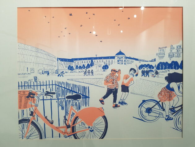 Ariane Pinel va donc passer son automne et son hiver 2020 – 2021 à sillonner Strasbourg sur son vélo, de places en places. « Il faisait froid, et c’était le confinement, donc je ne restais pas forcément longtemps sur chaque place, mais j’ai fait des croquis, j’ai pris des photos. Parfois, c’étaient des places que je connaissais bien, parfois moins. J’ai aussi parlé à des habitants pour qu’ils me racontent des anecdotes et des histoires, comme à l’Elsau par exemple. » Mais pour certaines places, les anecdotes croquées sont issues directement de la vie de la jeune illustratrice. Comme la planche de la place de la Gare par exemple, où l’on voit une jeune fille à vélo se faire siffler :