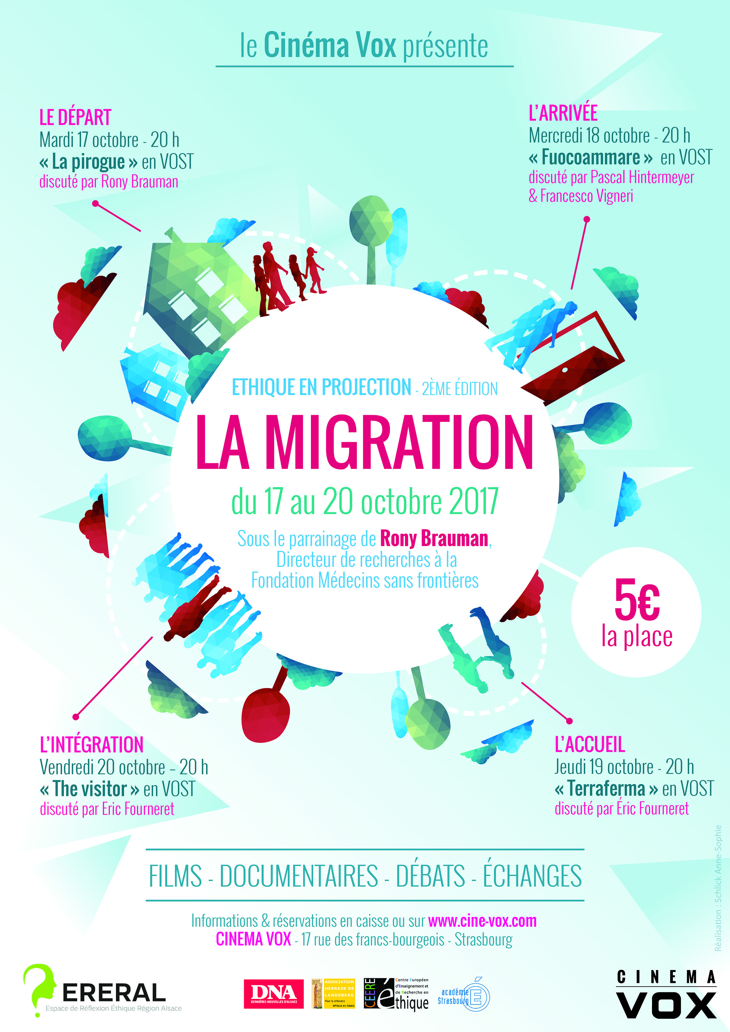Du mardi 17 au vendredi 20 octobre, le cinéma Vox, en partenariat avec l’Ereral (Espace de réflexion éthique région Alsace), accueille la deuxième édition de « L’éthique en projection. » Cette année, le festival ouvre le débat autour de quatre étapes de la migration : le départ, l’arrivée, l’accueil et l’intégration. Des films grand public seront diffusés et suivis d’un débat, animé par des professionnels.