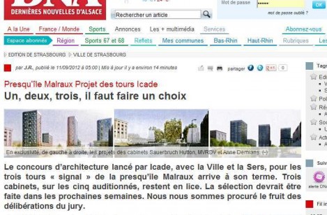 Les DNA se sont procurées les esquisses des trois projets encore en lice dans le concours d’architecture lancé par Icade, avec la Ville et la Sers, pour les trois tours de la presqu’île Malraux. Le premier projet, présenté par Sauerbruch Hutton, est en céramique mate et en verre, et propose un restaurant avec terrasse sur le toit. Le deuxième, par MVDRV, est très écolo avec des pots suspendus en façades. Le troisième, d’Anne Demians, promet des reflets changeants selon le point de vue…