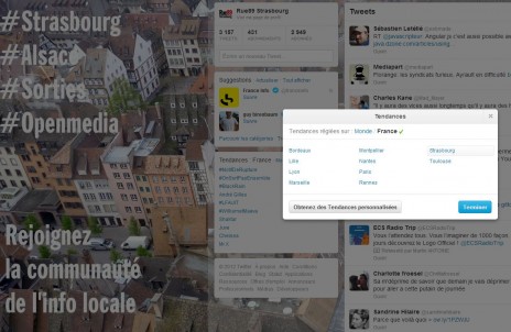 Pour choisir Strasbourg comme ville de préférence dans Twitter trends, cliquez sur « Modifier » à côté de « Tendances » à droite de l’écran, puis « modifier » puis « France » et « Strasbourg ».