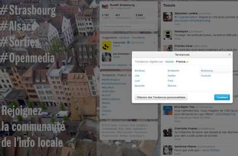 Strasbourg fait partie des nouvelles villes désormais localisables dans les « trends » (tendances) de Twitter. Dans ce réseau social basé sur l’échange d’informations, il peut y avoir des « tendances », qui sont souvent liées à des évènements, attachés à des mots-clés (hashtags)… C’est une mesure de ce qui « buzz » sur un territoire donné. Un soir d’ « Amour est dans le pré » à la télévision par exemple, le mot-clé #ADP fait partie des tendances pour la France sur Twitter à coup sûr.