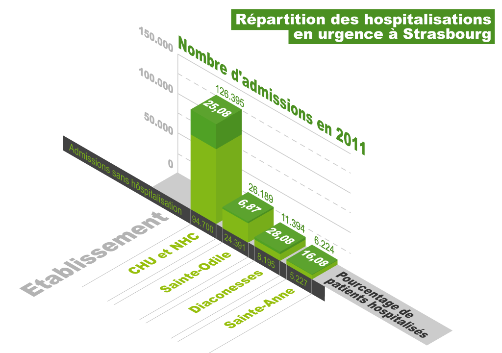 Des cliniques par exemple ? Malheureusement, la participation de trois cliniques privées (Diaconesses, Sainte-Odile, et Sainte-Anne depuis 2011) à la mission d’accueil d’urgence à Strasbourg n’a pas permis de réduire le flux de malades vers les deux hôpitaux. Car les cliniques n’accueillent guère les cas lourds, préférant les cas ne nécessitant pas d’hospitalisation. Ce qui n’est guère étonnant puisque le forfait de la Sécurité sociale pour une admission en urgence ne comporte qu’une seule nuit. Au delà, la structure d’accueil perd de l’argent. Par ailleurs, les urgences vitales ou graves, ainsi que les urgences pédiatriques, sont systématiquement dirigées au CHU.